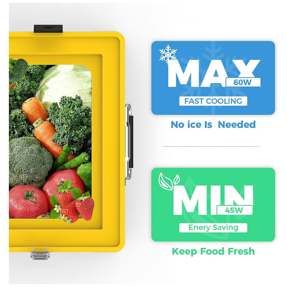 É um frigorífico portátil de 45L, perfeito para viajar ou trabalhar ao ar livre.