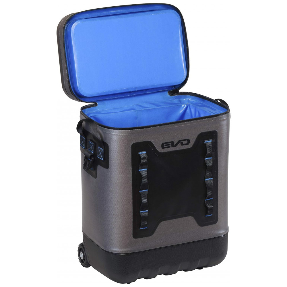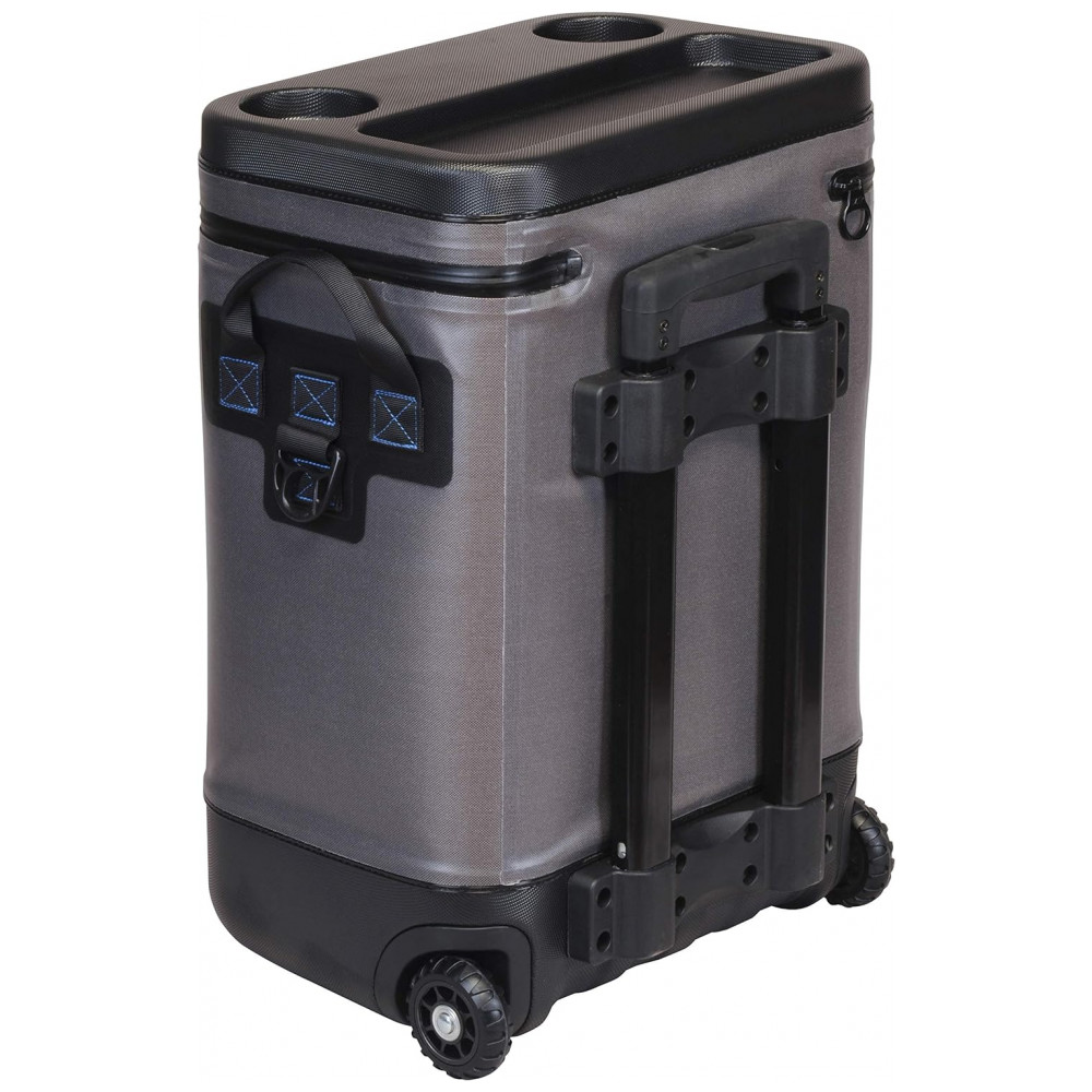 zenamento suficiente a bolsa térmica sobre rodas tem tampo moldado em ABS com porta bebidas e 8 presilhas para acessórios na frente que oferecem o máximo de zenamento.