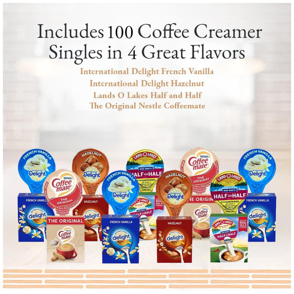 Creme Líquido para Café com 4 Sabores Variados, 100 Unidades, Delight, Land Lakers Half e Nestlé Coffe Matte: Este pacote de variedades individuais de creme de café é embalado por Bools e apresenta um conjunto internacional de creme de café Delight, mini creme de café Delight, Coffee Mate Original Mini Moos e 4 sabores sortidos de 100 pacotes de creme de café individuais.
