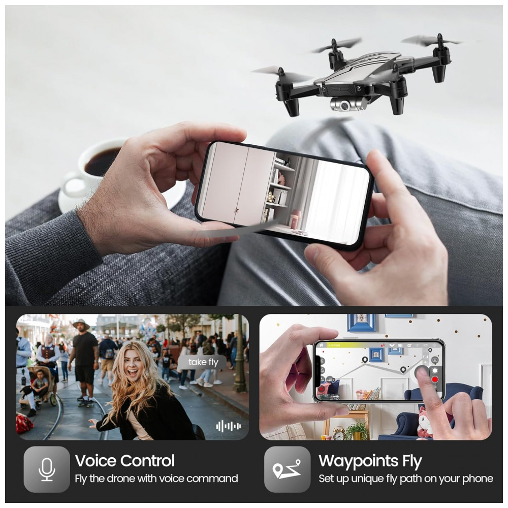 Controle de Voz e Gesto Selfie Permite controlar o drone com simples comentários de voz como Decolar pousar Poste um sinal V ou palma na frente da câmera, o drone pode tirar fotos ou vídeos automaticamente, bom para selfie
