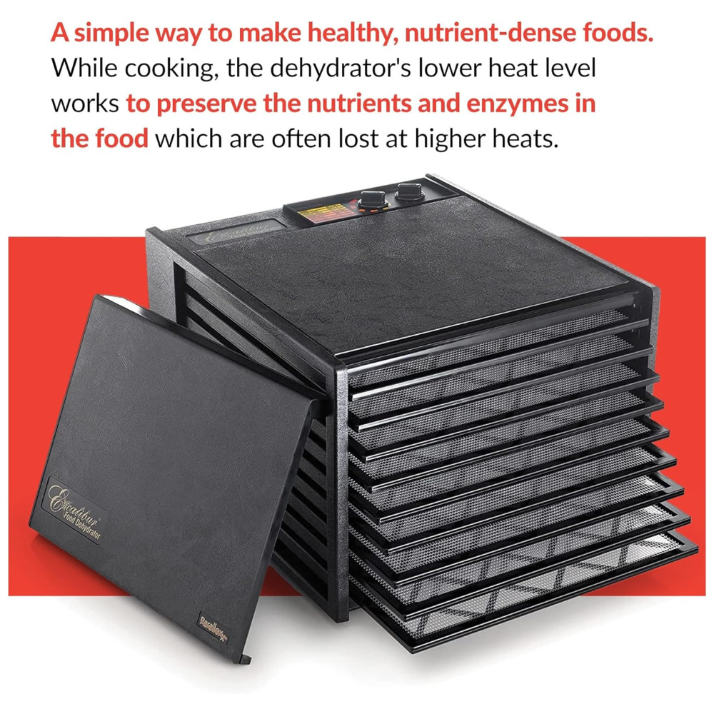 O seu desidratador Excalibur oferece a oportunidade de cozinhar em temperaturas de secagem mais baixas, o que aumenta o valor da vitamina que aumenta a imunidade nos alimentos e o mantém por até 9 meses quando zenado em um recipiente hermético.