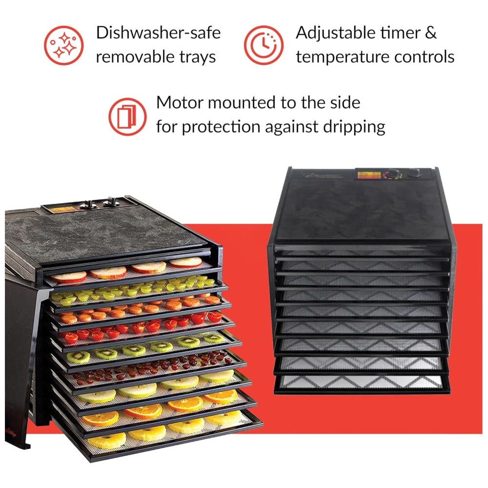 O desidratador grande de 9 bandejas Excalibur fornece 1,39 m quadrado de espaço de secagem, tornando o o maior e melhor que existe Ideal para famílias grandes, grandes jardins, artesãos e esportistas.