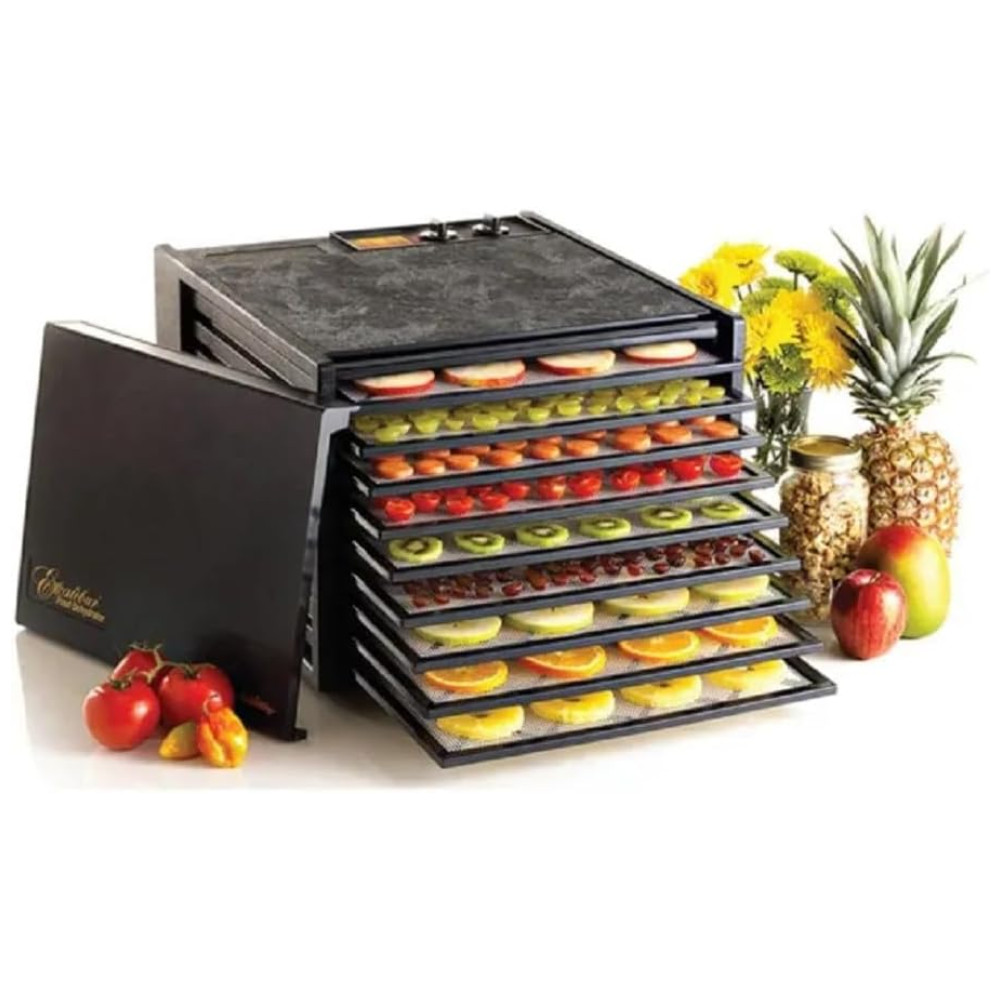 Desidratador de alimentos elétrico Excalibur 3926TB com 9 bandejas com configurações de temperatura e desligamento automático com timer de 26 horas para secagem mais rápida e eficiente Inclui guia de desidratação fabricado nos EUA, 9 bandejas, preto A desidratação é a maneira mais saudável, mais fácil e mais econômica de preservar os alimentos.