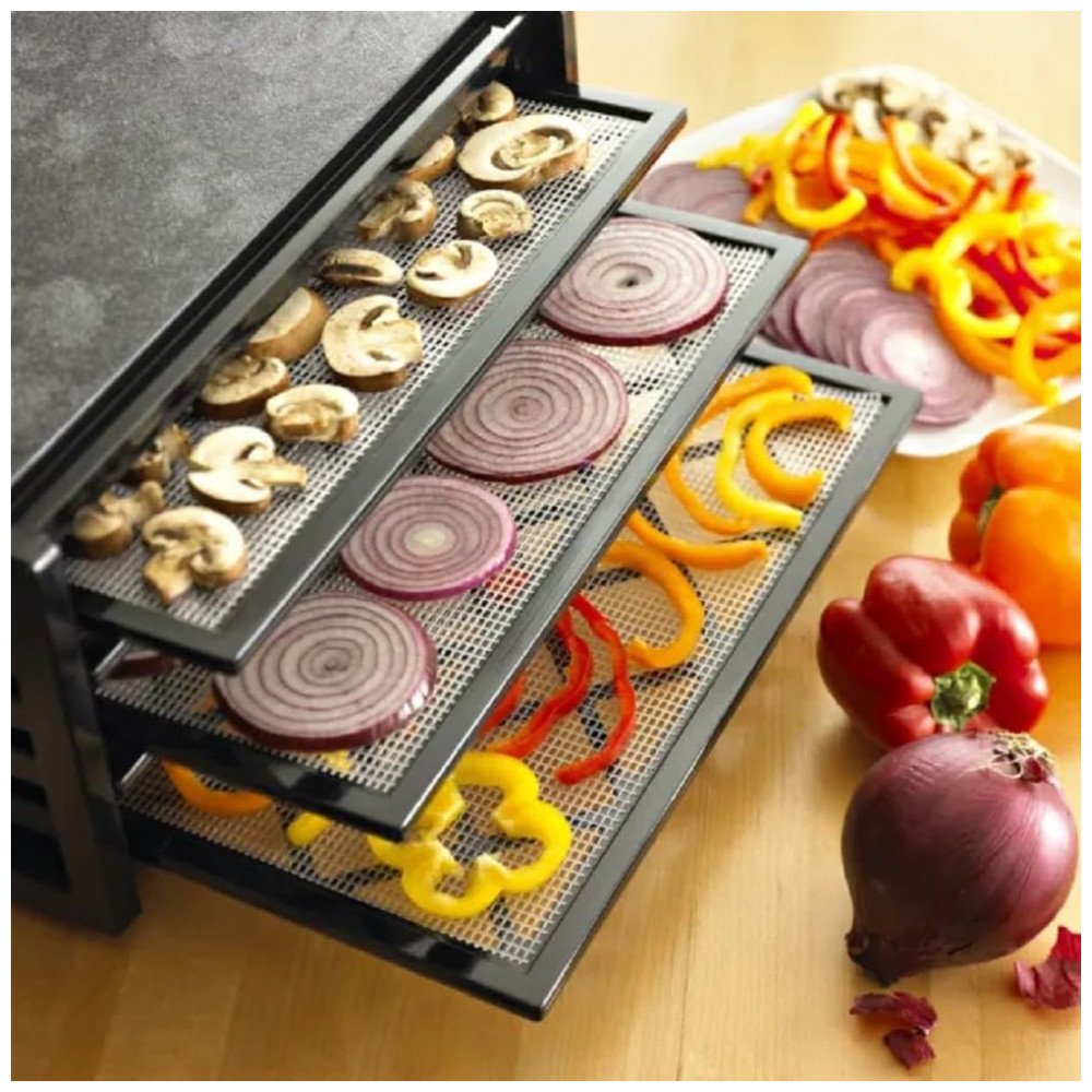 Desidrate frutas, legumes, nozes, carne seca, purê de frutas para enrolar frutas, crie pão, faça todos os petiscos naturais ou iogurte caseiro ACESSÓRIOS Inclui inserções flexíveis de bandeja de tela múltipla para impedir que os alimentos grudem e as bandejas não precisem ser movidas ou giradas durante a operação Inclui guia para desidratação.