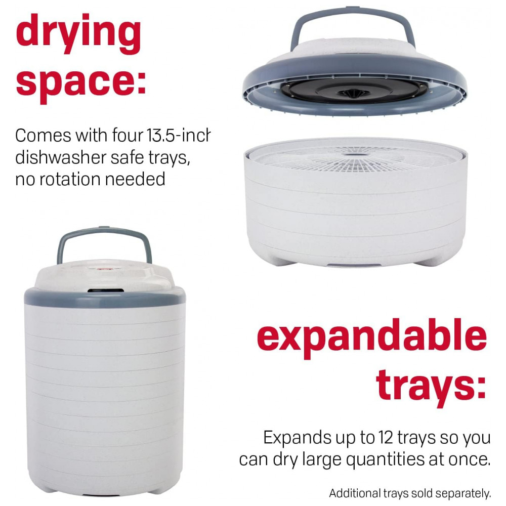 4 Bandejas livres de BPA com 0,8 pés quadrados de área de secagem por bandeja Expansível para 12 bandejas Orgulhosamente fabricado nos EUA de componentes globais e domésticos Inclui 2 folhas de rolo de frutas, 2 telas limpas, uma amostra de tempero e cura para Jerky e uma receita de 52 páginas e livro de instruções