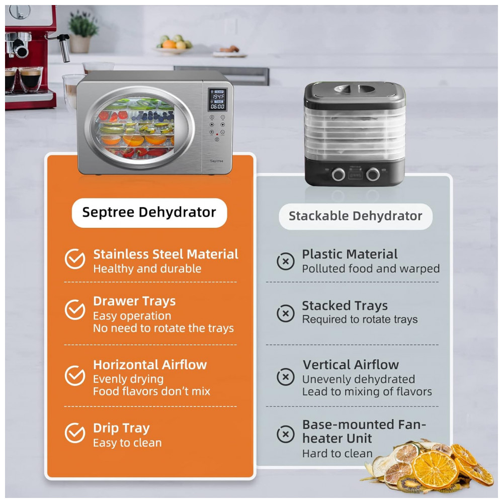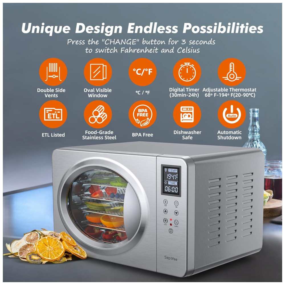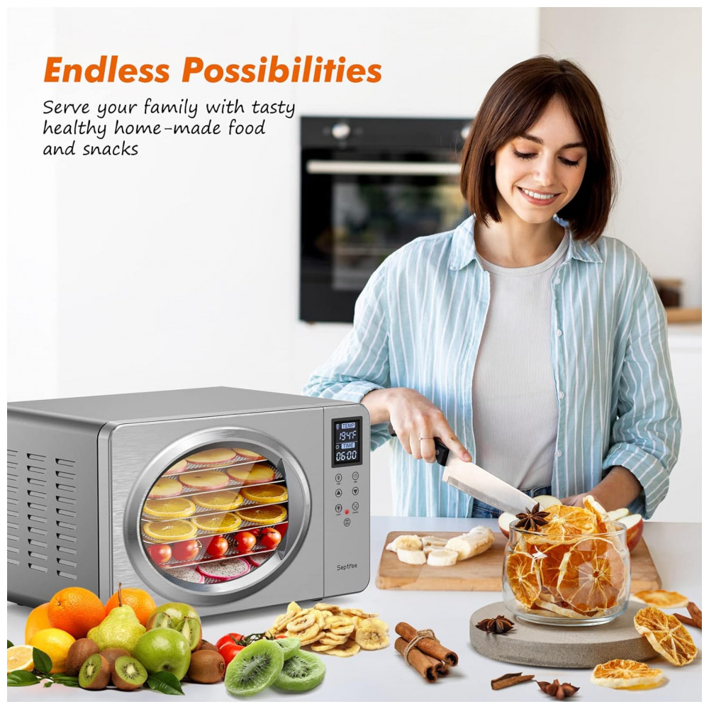 Desidratador de Alimentos com 6 Bandejas e Painel de Controle Digital, 500W, 110v, SEPTREE DSC 06B, Prateado: Design inovador e exclusivo O desidratador de aço inoxidável prateado recém projetado é requintado e avançado.