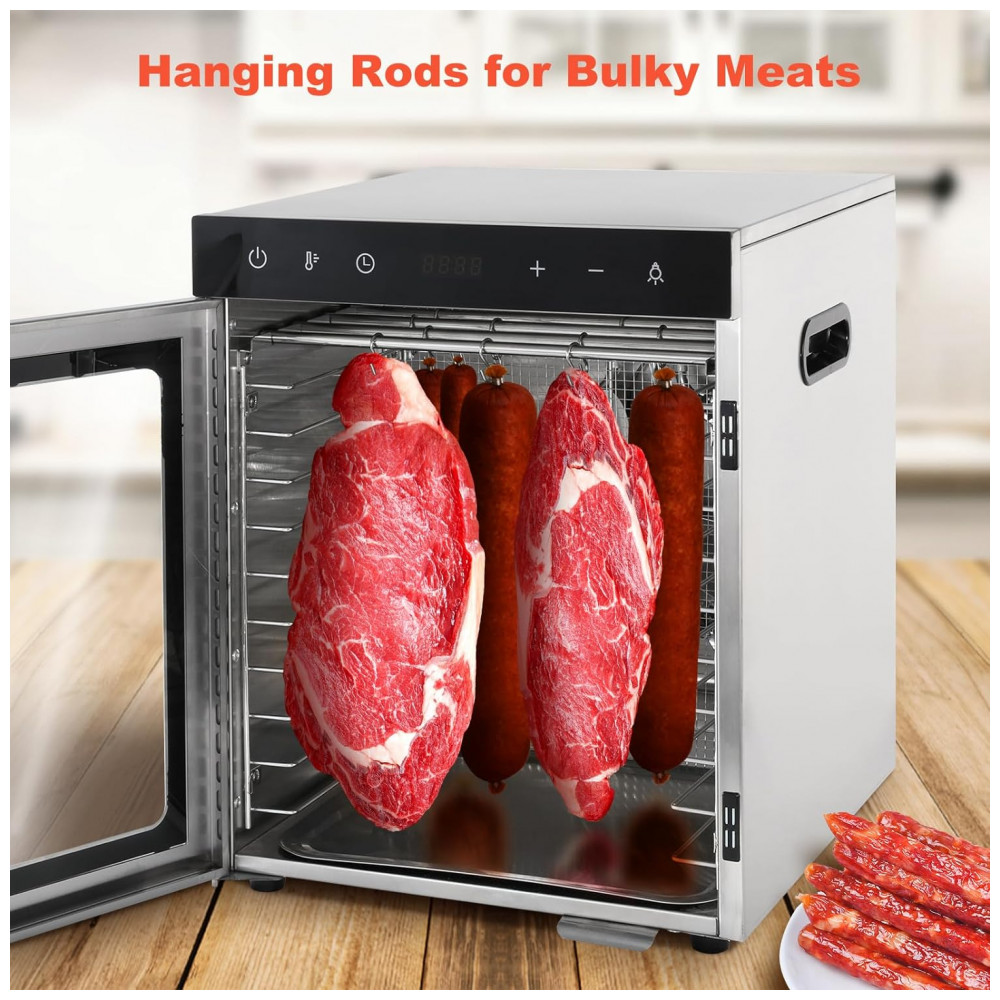 Desidratador de Alimentos em Aço Inoxidável com 10 Bandejas, Gancho de Cabide e Temporizador 24H, 800W, Hiteemer, Prata
