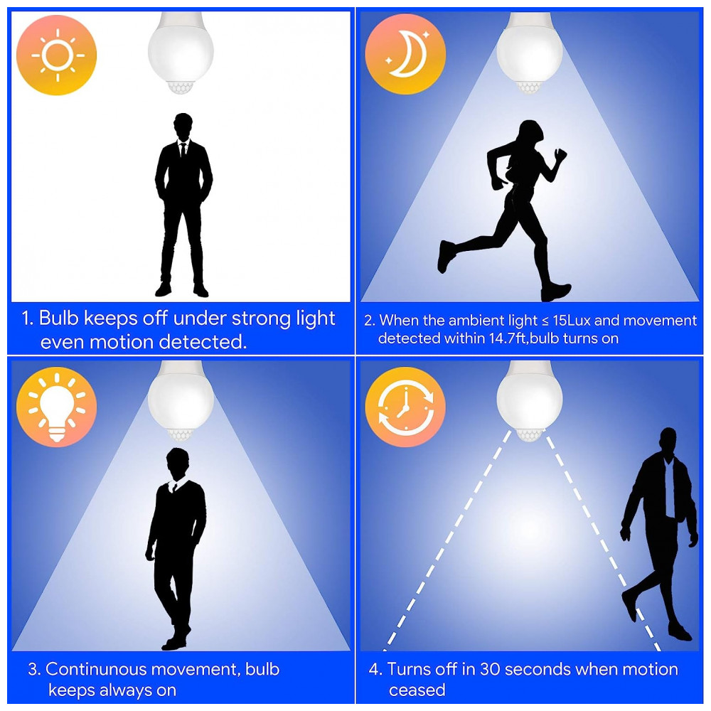 Ativação automática quando o detector detecta um objeto em movimento a 14,7 pés e desligamento automático após 30 segundos sem movimento. A lâmpada de movimento acenderá apenas qua…