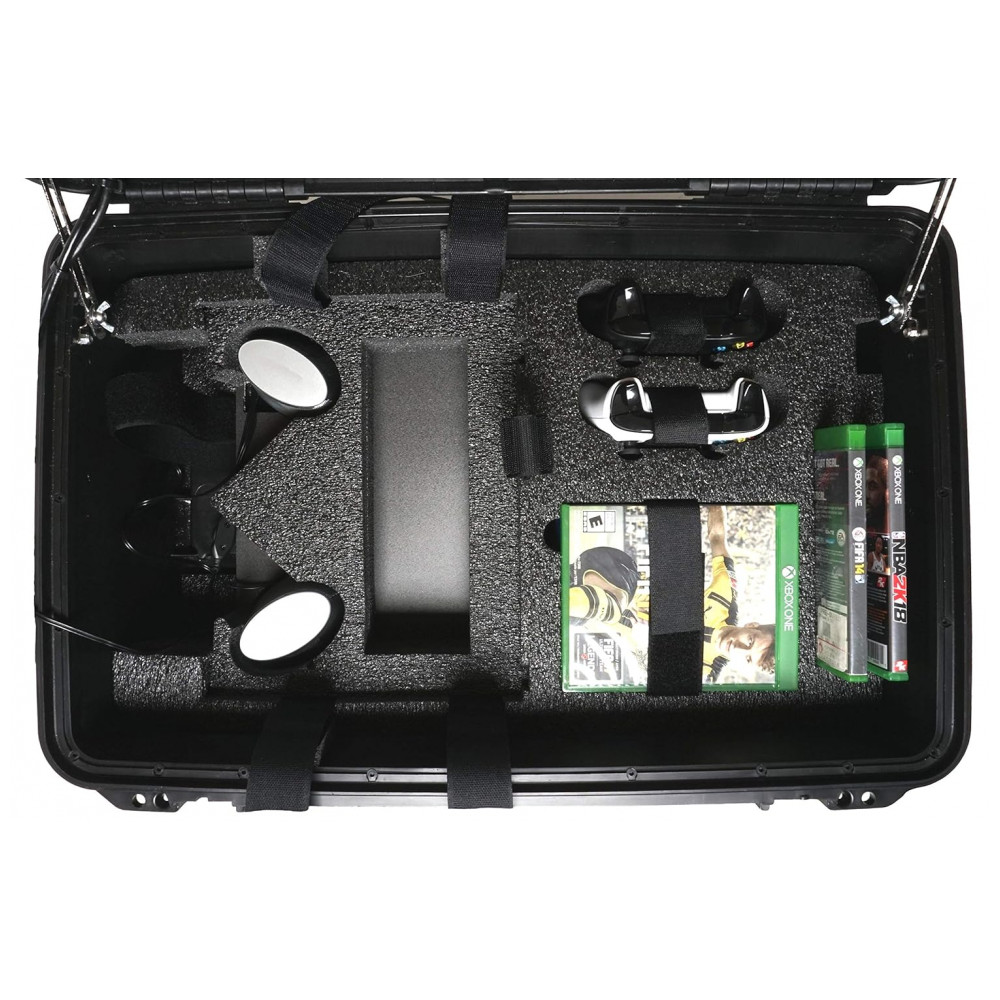 Estação de game portátil, com monitor. Console e acessórios não incluídos, CASE CLUB, Preto: Caso se encaixa no Xbox One X ou Xbox One S não incluído, juntamente com 2 controladores e 8 jogos não incluídos O case vem com monitor de , alto falantes externos removíveis e espuma personalizada Especificações do monitor resolução 1080p, tempo de resposta 8ms 5ms GtG, taxa de atualização 60 Hz, proporção de aspecto 16 9, ângulo de visão de 178 graus, tecnologia adaptativa de inteligência de brilho A caixa é à prova dágua, hermética, com cadeado, com rodas, tem tampa para ângulo de visão ajustável, jogos podem ser descarregados e carregados sem remoção do console.