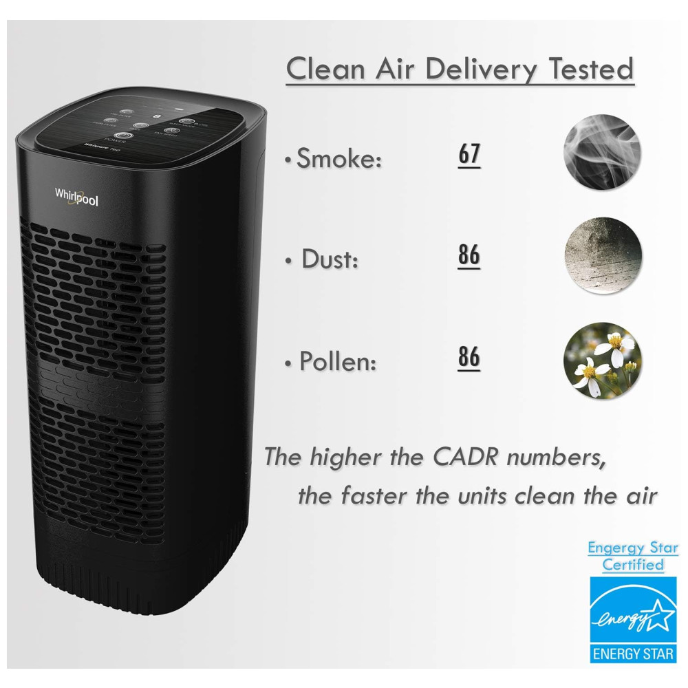 Os purificadores de ar Whirlpool pretos usam filtros HEPA, que filtram até 99.