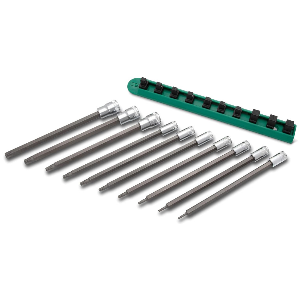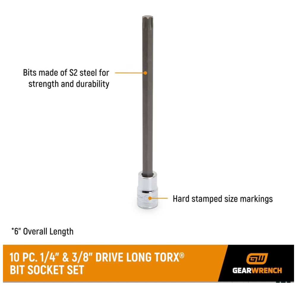 Chave de engrenagem 80588 Conjunto de soquetes torx longos de 10 peças composto por 82510 T8, 82511 T10, 82512 T15, 82513 T20, 82514 T25, 82515 T27, 82516 0, 82517 T40, 82518 T45 e 82519 T50 soquete de bit longo torx 1 , 4 Unidade em polegadas.