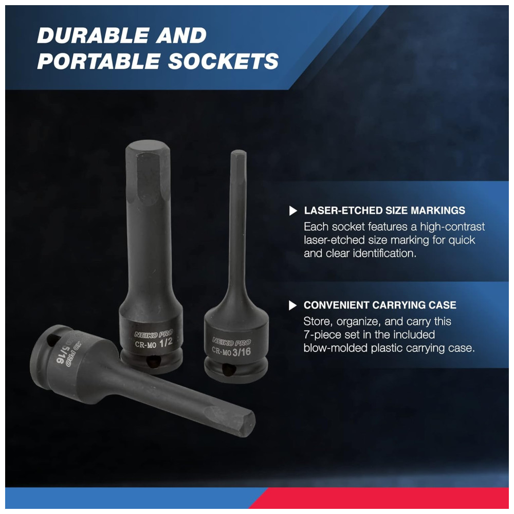 Ferramenta Automotiva Tekton Conjunto de Soquetes de Brocas Allen 7 Peças, NEIKO 01131B, Vermelho: Soquetes de impacto hexagonais em aço forjado preto cromo molibdênio.