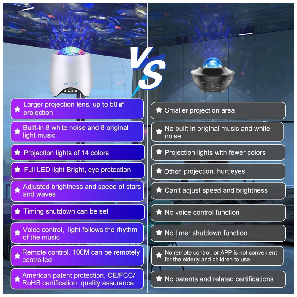 Projetor Starry Sky e Ocean Wave atualizado O projetor star Flyinwe usa uma lente de projeção maior com uma área máxima de 50, que oferece uma experiência estrelada e oceânica imer…