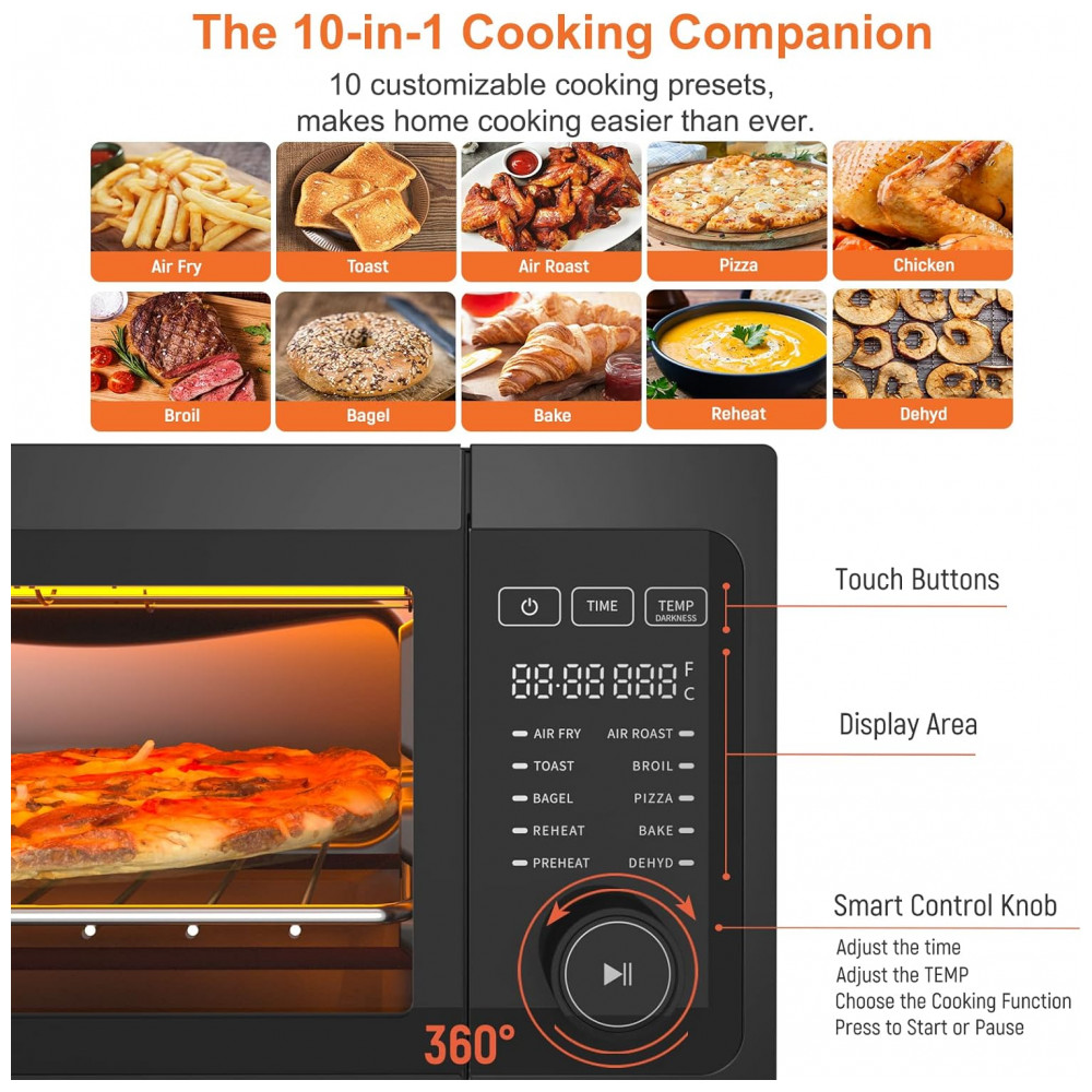 10 FUNÇÕES PRÉ DEFINIDAS Este versátil forno de fritadeira a ar Fabuletta é programado com 10 funções de cozimento predefinidas, pré aquecer, fritar ao ar, pizza, assar ao ar, torr…