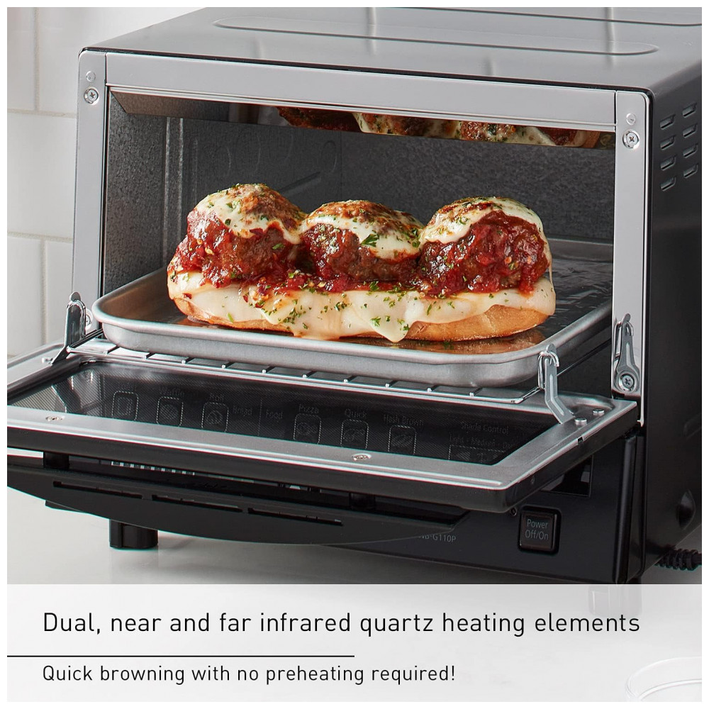 Forno Elétrico de Bancada com Bandeja de Migalhas 1300W, 110v, PANASONIC NB G110P K, Preto: Os elementos de aquecimento infravermelho duplo de alta eficiência de quartzo e cerâmica são posicionados na frente e atrás para torrar, assar, dourar e reaquecer uniformemente Controle preciso de temperatura Asse facilmente pães frescos bem quentes e refeições preparadas, uma variedade infinita de acompanhamentos saborosos, canapés caseiros e muito mais com um conveniente sensor de controle de temperatura com botão de toque manual Vê através da porta de vidro a porta resiliente e transparente é conectada à prateleira para assar para puxar a prateleira de maneira suave e segura em sua direção quando a porta é aberta Design compacto e limpo o design compacto do miniforno flashxpress destaca qualquer decoração de cozinha ou bancada Fácil de usar o miniforno flashxpress inclui uma bandeja interna quadrada perfeita para pizza de até de diâmetro ou até quatro fatias de pão, além de bandejas removíveis para migalhas