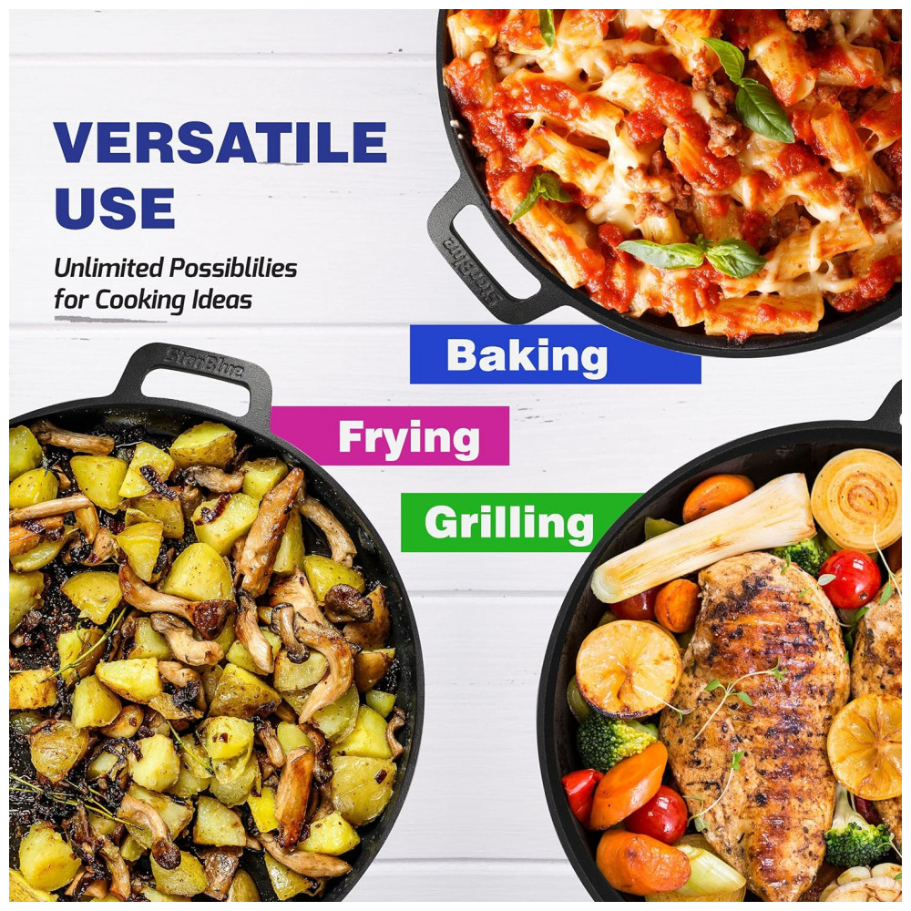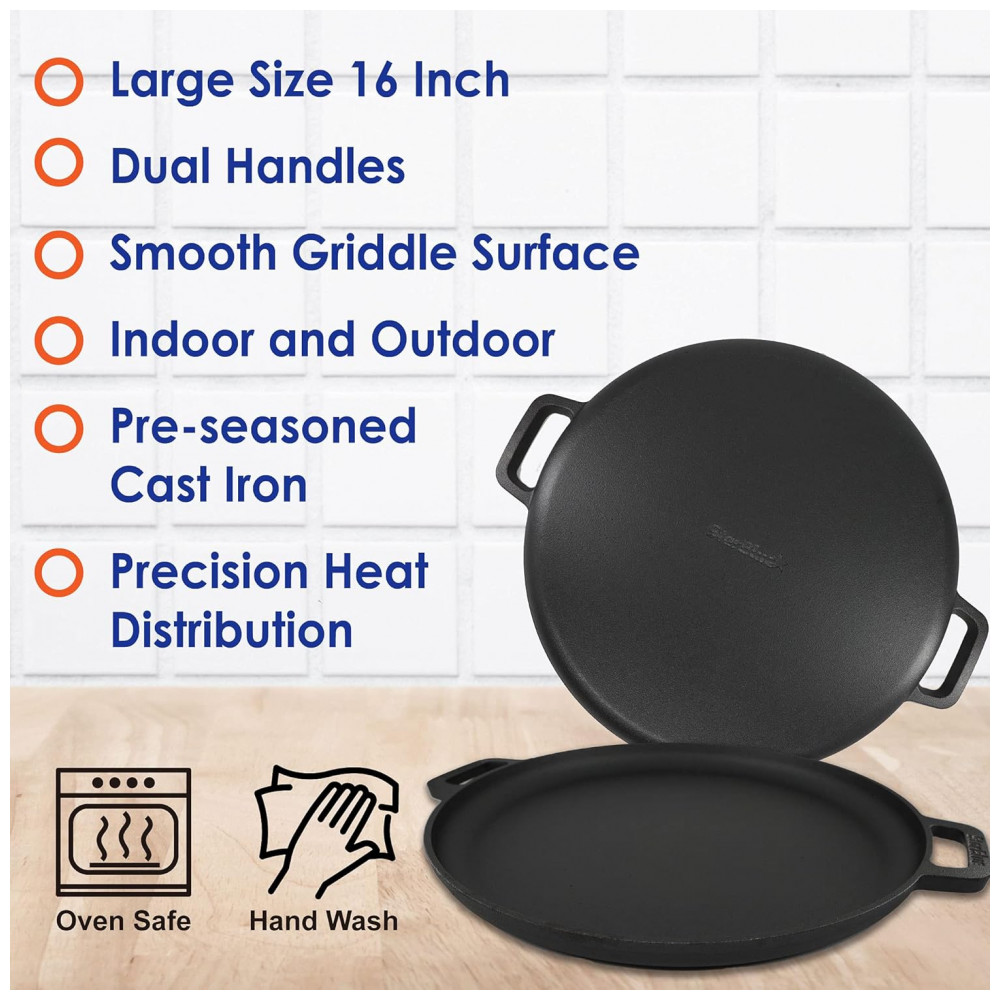 Seja assando uma pizza ou servindo tudo ficará impecável com nossa grande forma de pizza de ferro fundido de 16 polegadas com alças de silicone.
