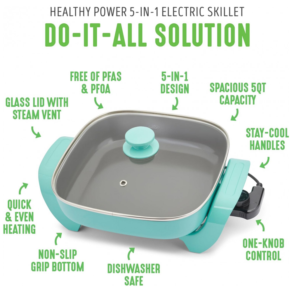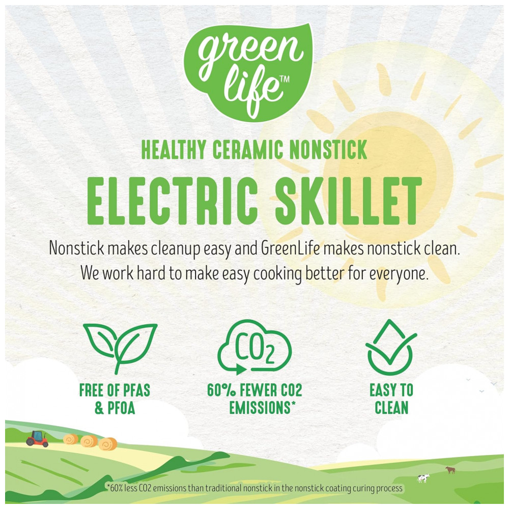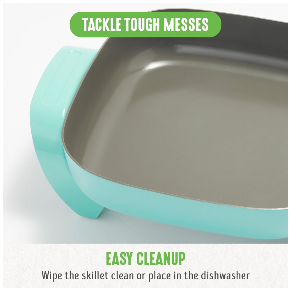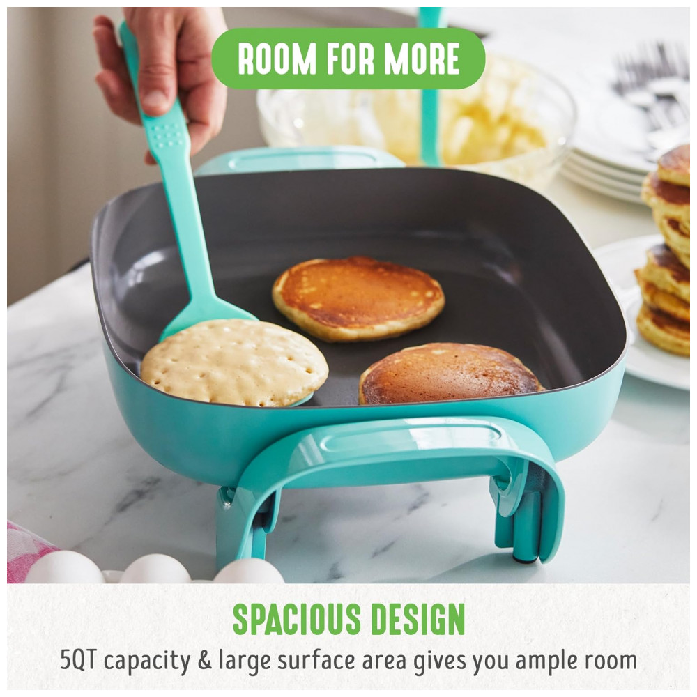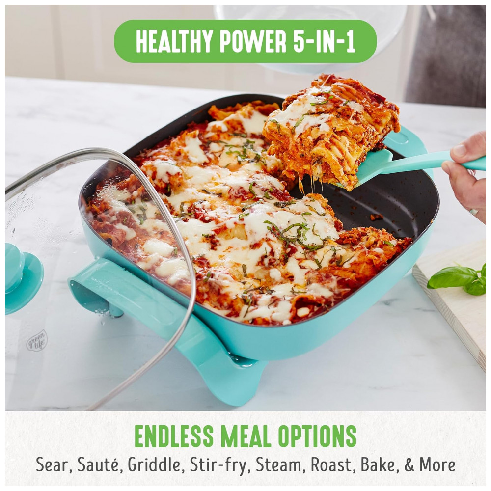 Frigideira Elétrica 5 em 1 de Cerâmica, Capacidade 5L, Turquesa, turquesa, 110V, GREENLIFE CC003725 002, Azul turquesa: Apresentando a Frigideira Elétrica Quadrada GreenLife de 30 cm e 5 Litros a escolha perfeita para quem busca praticidade, saúde e eficiência na cozinha Nossa cobertura antiaderente de cerâmica, fácil de limpar, é derivada da areia e livre de PFAS, PFOA, chumbo e cádmio, garantindo que os alimentos não grudem e proporcionando uma limpeza rápida.