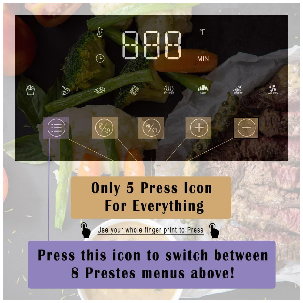 OITO PREDEFINIÇÕES VERSÁTEIS E PERSONALIZÁVEIS Este fritador elétrico multifuncional vem equipado com 8 botões, oferecendo uma variedade de opções de cozimento com temperatura e tempo de referência padrão quatro alimentos comuns na cozinha e quatro funções essenciais.