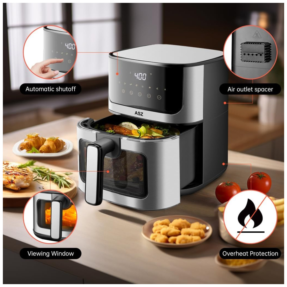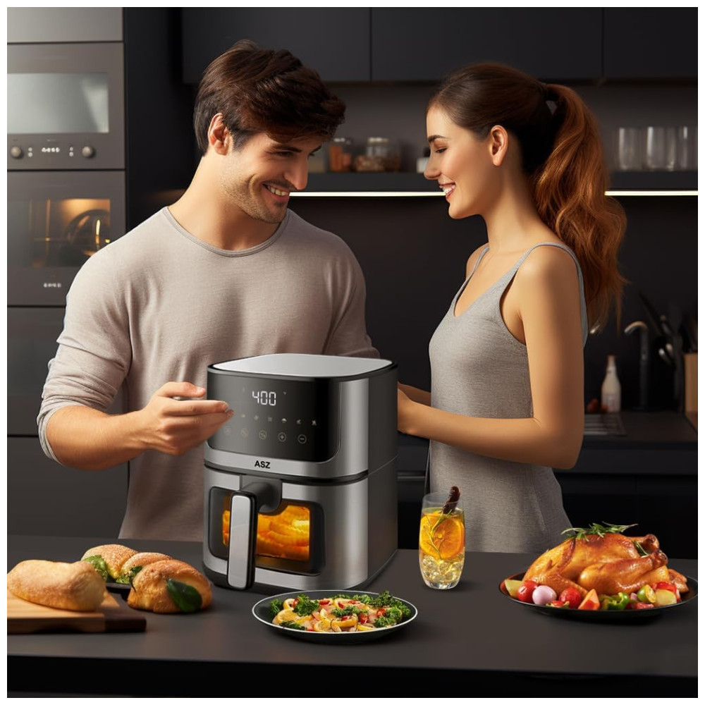 Descubra a Fritadeira ASZ Visual Air Fryer JANELA TRANSPARENTE A clássica Fritadeira ASZ de 4,6 L possui uma janela de visualização transparente na frente do cesto, permitindo moni…