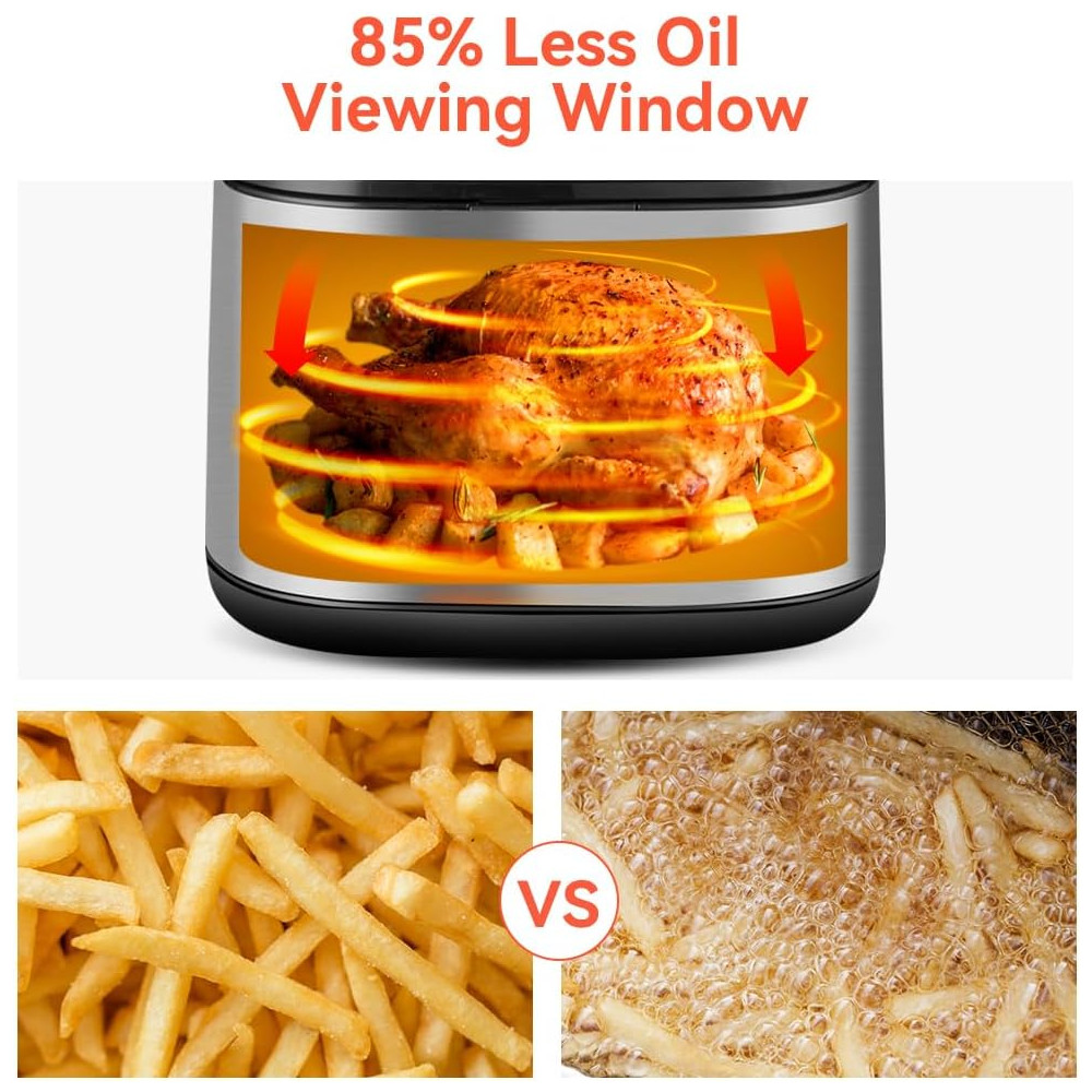 Fritadeira Elétrica Air Fryer 4,6L com Cesta Antiaderente, Temporizador, Controle de Temperatura e 8 Predefinições, 110V 1400W, ASZ, Prata e Preta: Descubra a Fritadeira ASZ Visual Air Fryer JANELA TRANSPARENTE A clássica Fritadeira ASZ de 4,6 L possui uma janela de visualização transparente na frente do cesto, permitindo monitorar o processo de cozimento dos alimentos em tempo real e ajustar o nível desejado de cozimento e crocância.