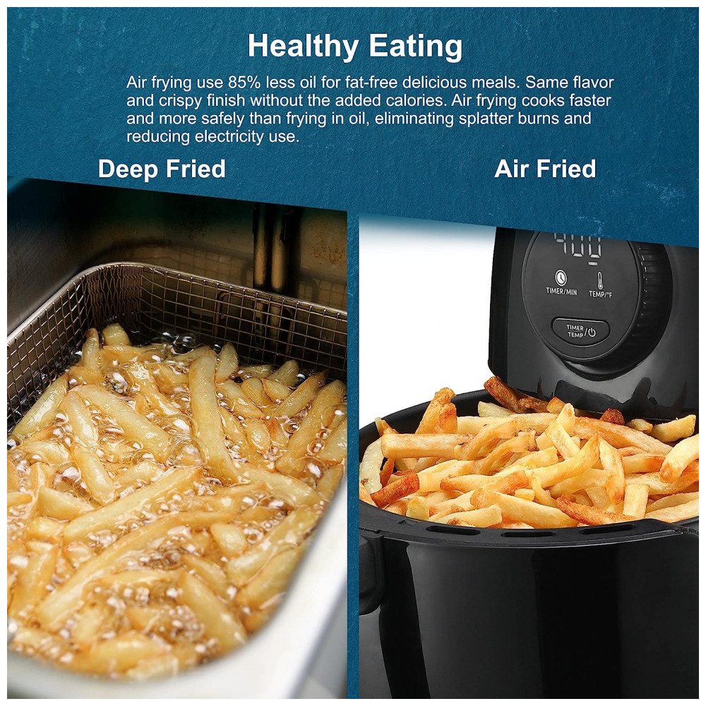 Cozinhe de forma mais saudável, rápida e segura do que na fritura tradicional com óleo, eliminando respingos, óleos gordurosos e reduzindo o consumo de eletricidade.