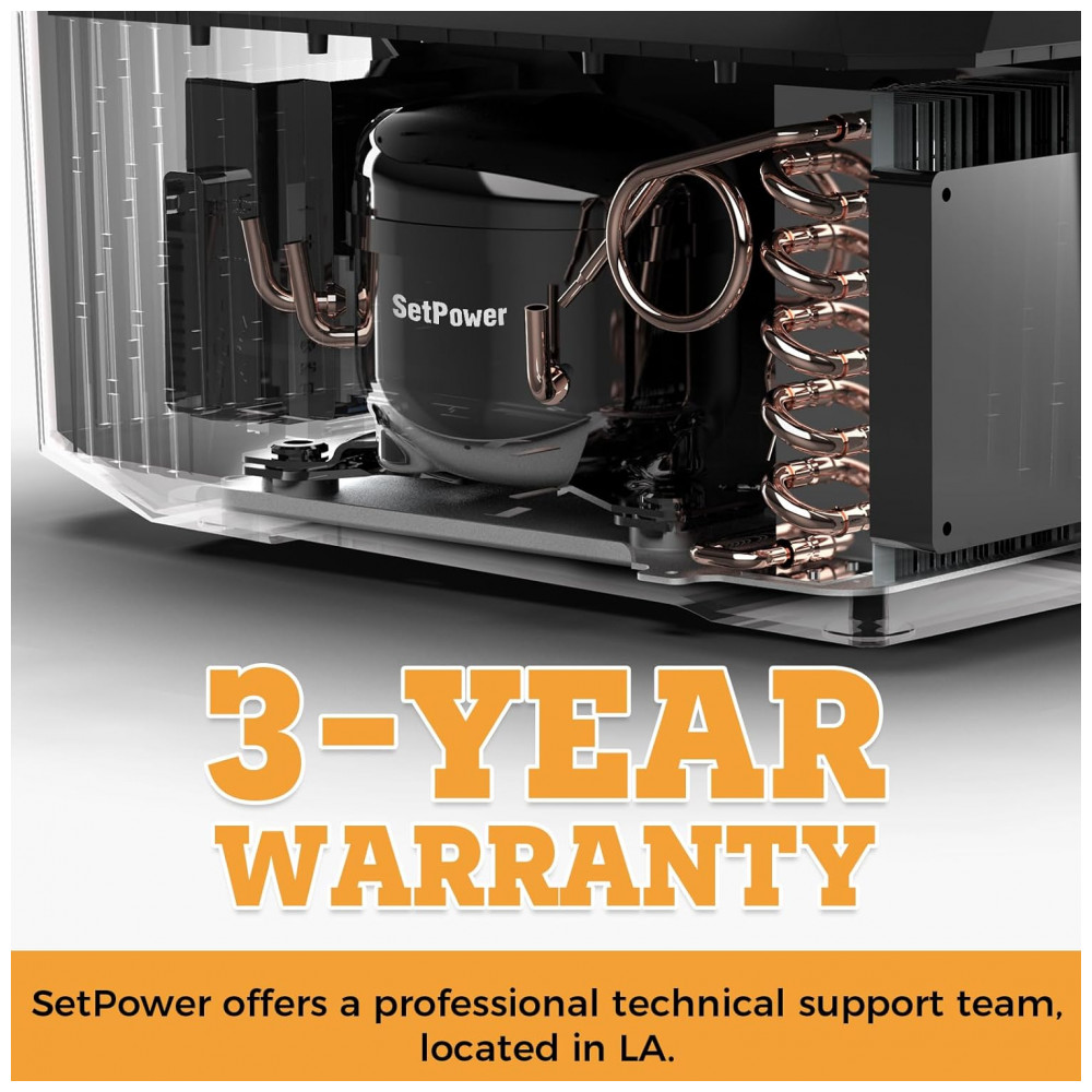 Resfriamento potente e baixo consumo de energia O refrigerador Setpower RV45D PRO de 12 volts resfria rapidamente, mas é eficiente e economiza energia, com um consumo médio de energia de 0,5 kWh, 24h, o que é realmente econômico.