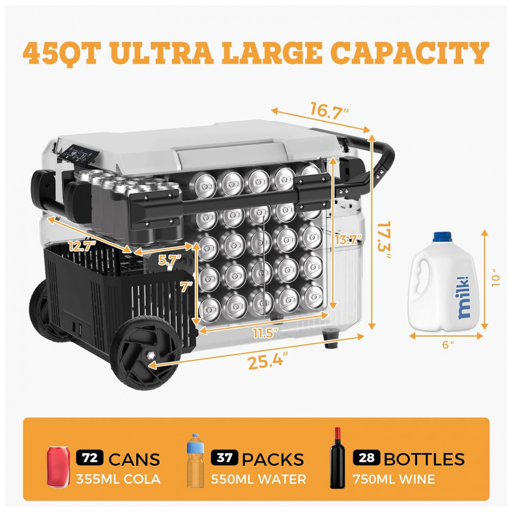 É um refrigerador de carro de 43L, grande capacidade pode zenar 52 latas de cola, 46 garrafas de água, que é um posto de preparação portátil para sua viagem.