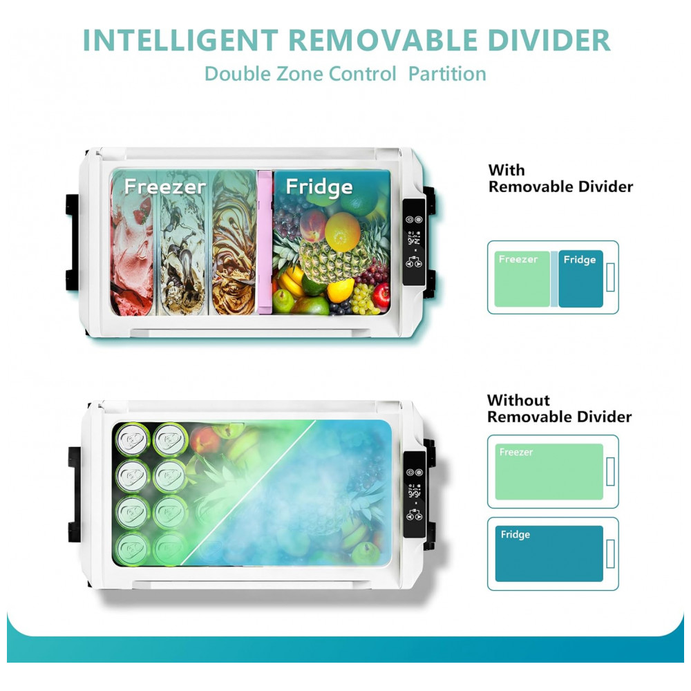 Geladeira e Congelador Portátil 57 L com Divisor Removível 12 24V DC 120 240V AC, EUHOMY, Preta: Zonas duplas e divisor removível Quando um divisor é inserido no meio do refrigerador Euhomy 12v, o refrigerador do carro é dividido em área de congelamento e refrigeração, a zona de congelamento pode ser ajustada individualmente em temperatura 20 C 20 C, fornecendo condições ideais de zenamento para bebidas, frutas e alimentos congelados.