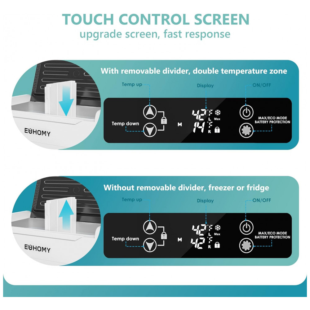 Zonas duplas e divisor removível Quando um divisor é inserido no meio do refrigerador Euhomy 12v, o refrigerador do carro é dividido em área de congelamento e refrigeração, a zona…