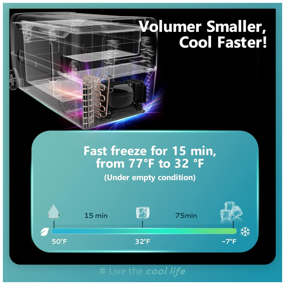 Eficiência e menor consumo O refrigerador Euhomy RV adota tecnologia avançada de refrigeração do compressor, fornece dois modos de resfriamento rápido e economia de energia.