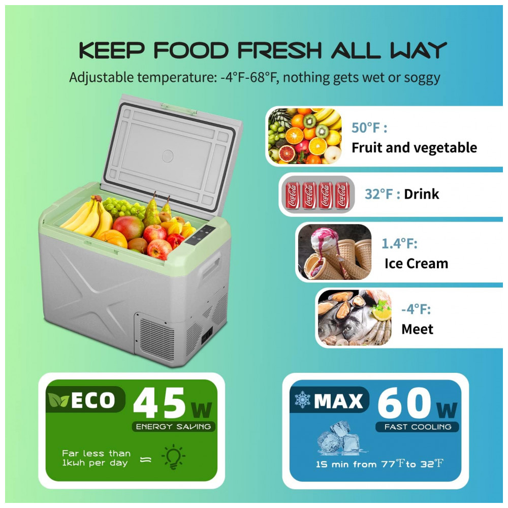 COMPARTIMENTO INNER capacidade de 32 quartos, o freezer portátil está equipado com luz LED para fazer com que você pegue algo frio facilmente no cesto de zenamento, o bujão de drenagem inferior foi projetado para limpar sua geladeira.