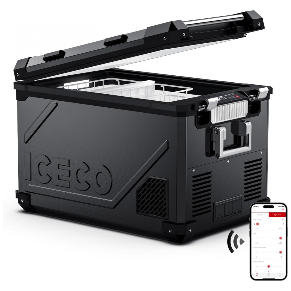 Geladeira Portátil 55L com Compressor SECOP, DC 12 24V, AC 110 240V, ICECO APL55, Preto: Tecnologia avançada O refrigerador portátil APL55 pode ter temperatura controlada por meio de aplicativo móvel.