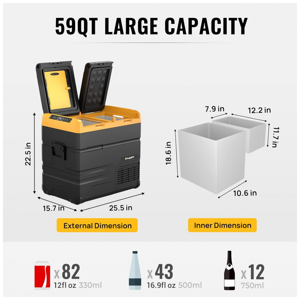 Geladeira Portátil 55L de Zona Culpa com Controle Via APP, 12V 24V DC 110 240V AC, BougeRV, Preta: Zona dupla com porta dupla Este refrigerador portátil de 12 V possui zona dupla e porta dupla, permitindo controlar a temperatura separadamente para um verdadeiro controle de temperatura de zona dupla.