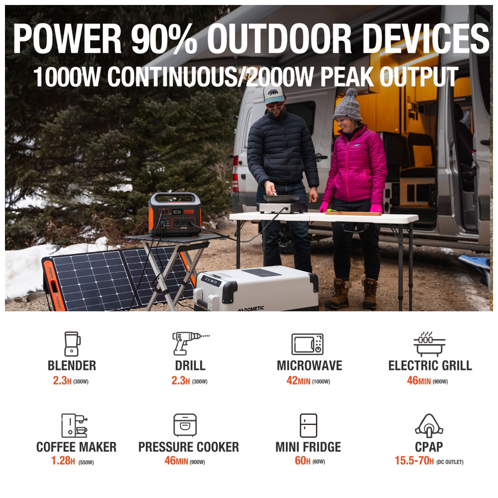 Carga O Jackery Explorer 880 pode carregar 8 dispositivos diferentes simultaneamente, como mini geladeira, telefone, drone, laptop, iPad, liquidificador, câmera e Kindle.