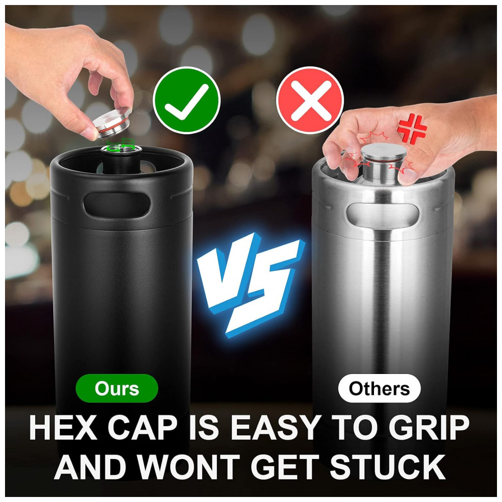 HEX CAP A cerveja produz dióxido de carbono durante a fermentação e zenamento, a tampa redonda do mini barril sempre difícil de segurar, e a nova tampa hexagonal projetada permite que você abra facilmente a tampa