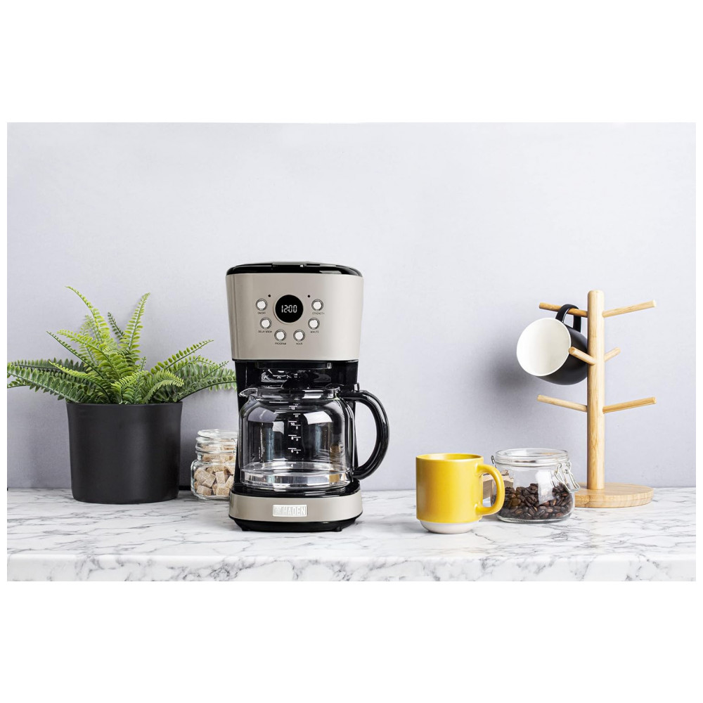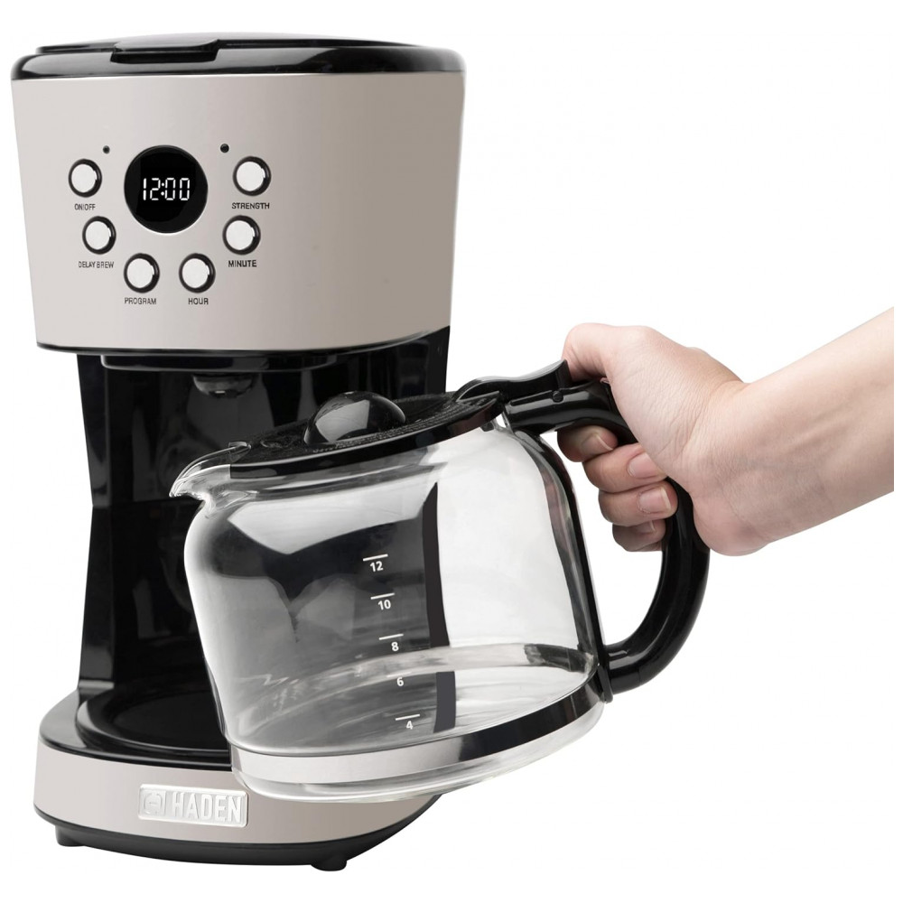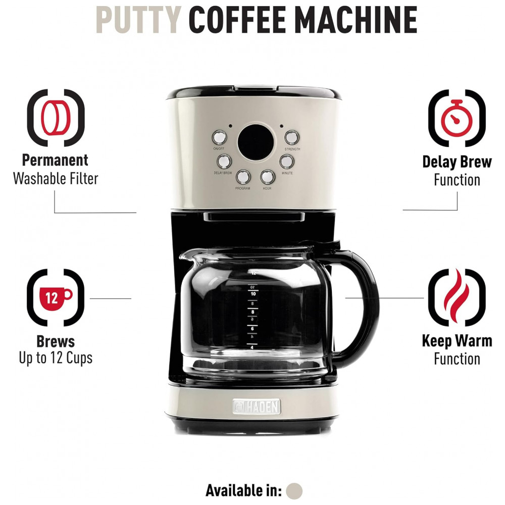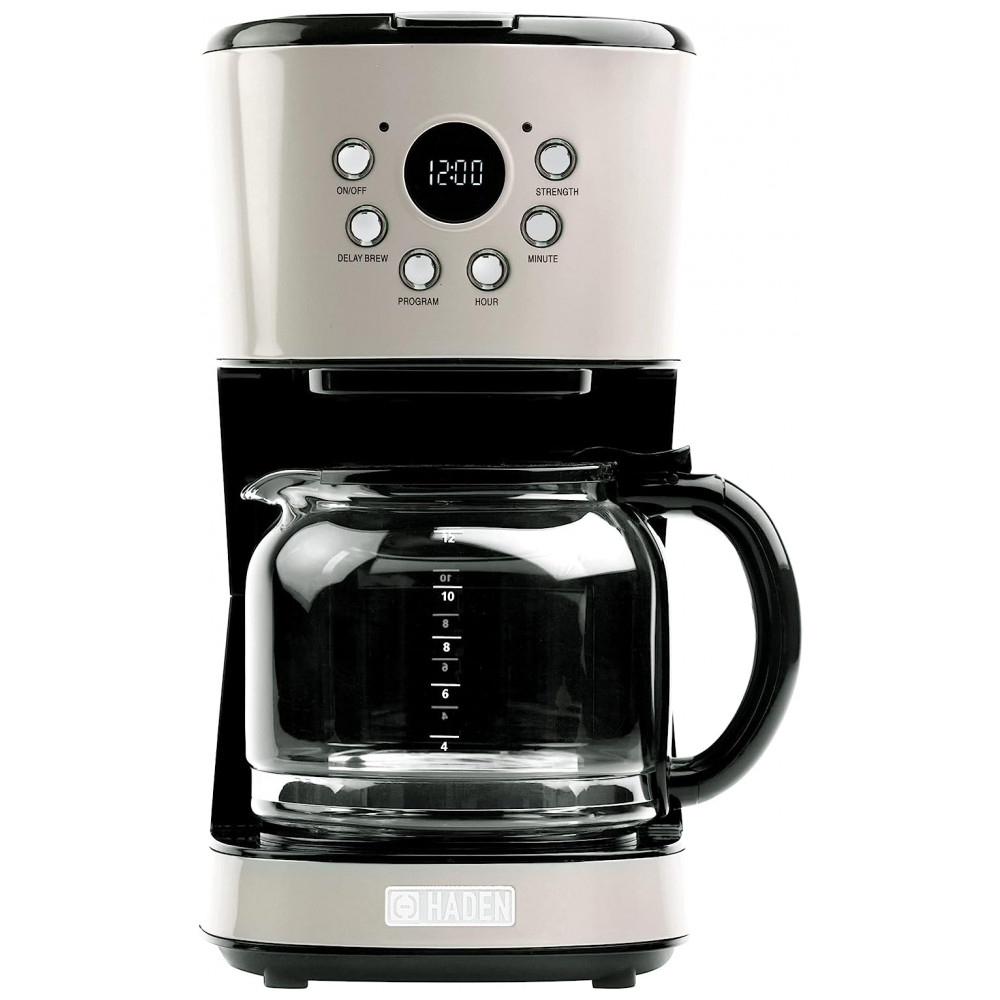 Haden 75028 Cafeteira Proframável Retro, Capacidade 1.5L, Aço Inox, 110V, Creme: FABRICANTE DE CAFÉ COM 12 CUPAS DE CAPACIDADE Ilumine sua manhã com uma xícara fumegante de sua bebida favorita, graças a esta cafeteira doméstica Capacidade 12 xícaras FUNÇÕES PROGRAMÁVEIS Fácil de usar com a função de manter aquecido, retardar a configuração da infusão e selecionar a intensidade da infusão DESLIGAMENTO AUTOMÁTICO Os recursos de segurança incluem função anti gotejamento de 30 segundos e desativa automaticamente a unidade após 120 minutos SE ENCAIXA EM QUALQUER COZINHA DE CASA Design compacto, elegante e moderno se encaixa perfeitamente em qualquer bancada, mesa e muito mais O cabo mede de comprimento para oferecer várias opções de posicionamento dentro de sua cozinha VEM COM CARAFE DE VIDRO a cafeteira vem com um filtro de água lavável e uma jarra de vidro com capacidade para 12 xícaras