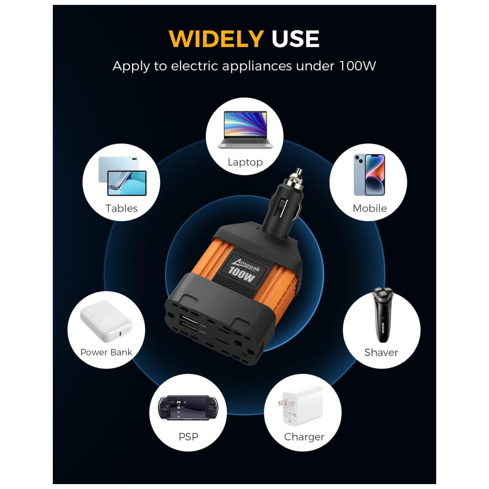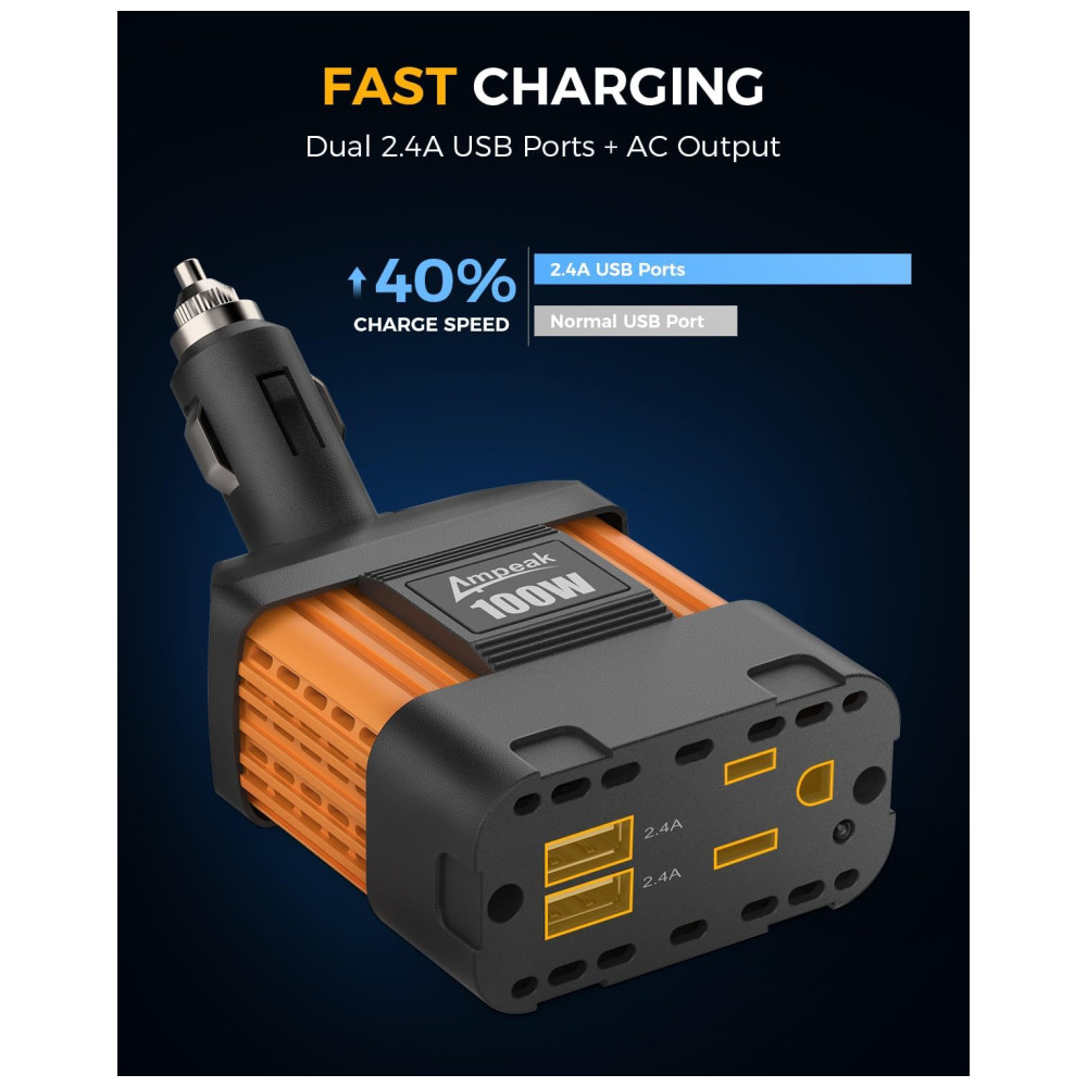 Inversor de Potência 100W DC 12V para AC Tomada AC e USB 2.1A Ultra Compacto, 110v, AMPEAK IVUFA0100, Laranja: Um inversor realmente poderoso.