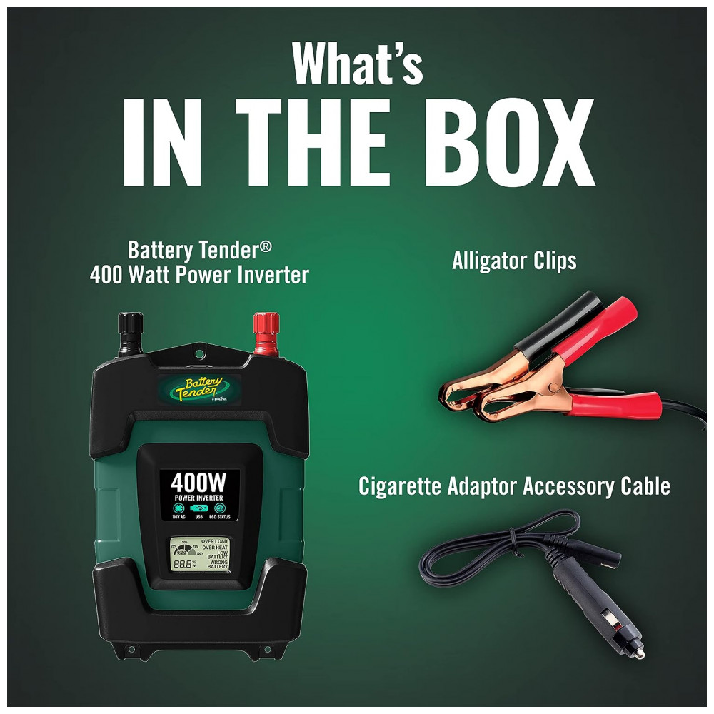 Inversor de Potência Automotivo 400W, 2 portas USB, BATTERY TENDER 026 0003 DL WH, Verde: Duas portas de saída CA fornecem uma saída contínua total de 400 W se conectadas diretamente à bateria do carro de 12 V com as pinças de crocodilo incluídas, saída contínua de 120 W se conectadas com adaptador de cigarro Duas portas USB 5 VDC, saída total combinada 3.