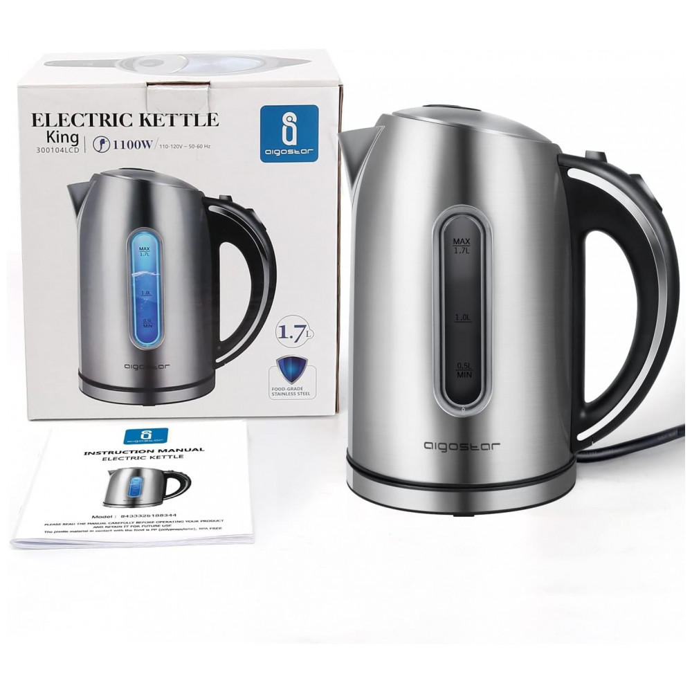 King Chaleira Elétrica sem Fio 1.7L com Desligamento Automático, 1100W, 110v, AIGOSTAR, Prateado: Chaleira elétrica com capacidade de 1,7 litros e 1100 watts de potência para resultados rápidos 110V 60Hz Base de alimentação com cabo de alimentação de 30 polegadas para posicionamento flexível, fácil de zenar com envoltório do cabo para espaço compacto.