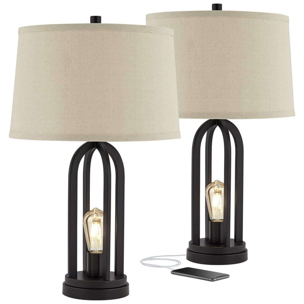 Luminária de Mesa Vintage em Metal com USB e Abajur de Tecido, FRANKLIN IRON WORKS 45P79, Marrom