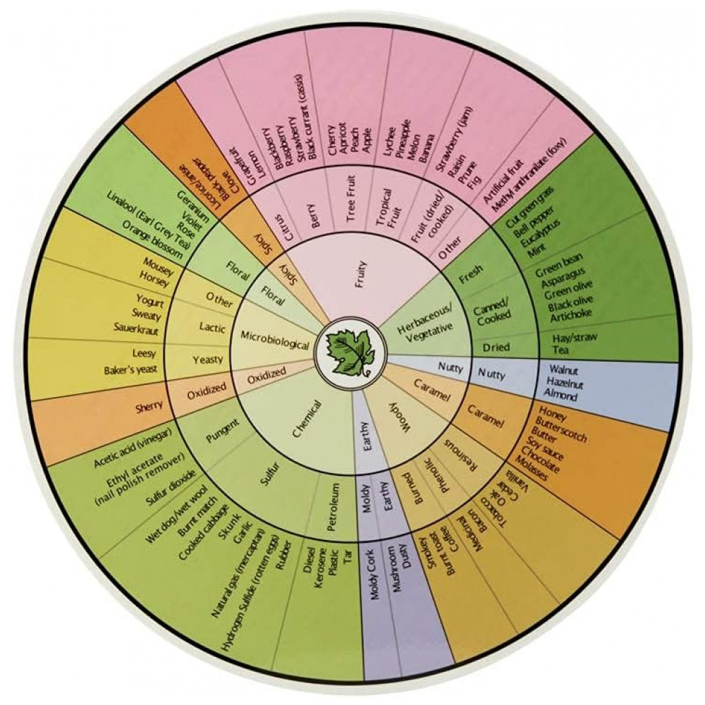 60 Aromas Damasco Amêndoa Maçã Banana Laranja Amarga Amora Preta Caixa de Groselha Preta Pão de Sebe Manteiga Caramelo Cereja Canela Cacau Café Cortiça Figo Flint Floresta vegetação rasteira Jogo Toranja Grama Pimenta Verde Chá Verde, Doces Duros Feno Avelã Mel Madressilva Jasmim Couro Alcaçuz Limão Linden Litchi Hortelã Cogumelo Carvalho Flor de Laranja Pêssego Pêra Pimenta Abacaxi Ameixa Marmelo Framboesa Rocha Rosa Rosa Morango Enxofre Tabaco Tagetes Alcatrão Trufa Baunilha Violeta Noz e Fermento