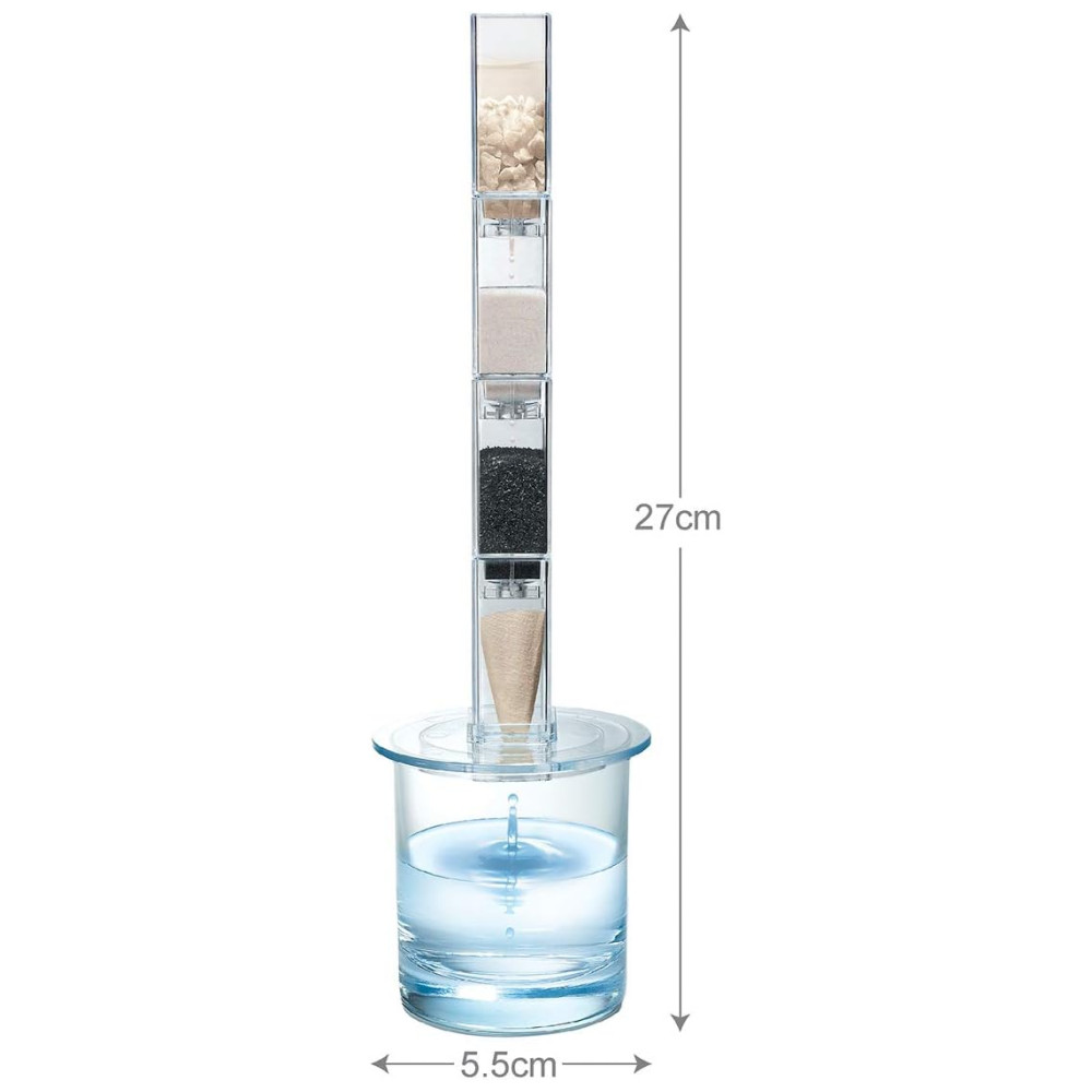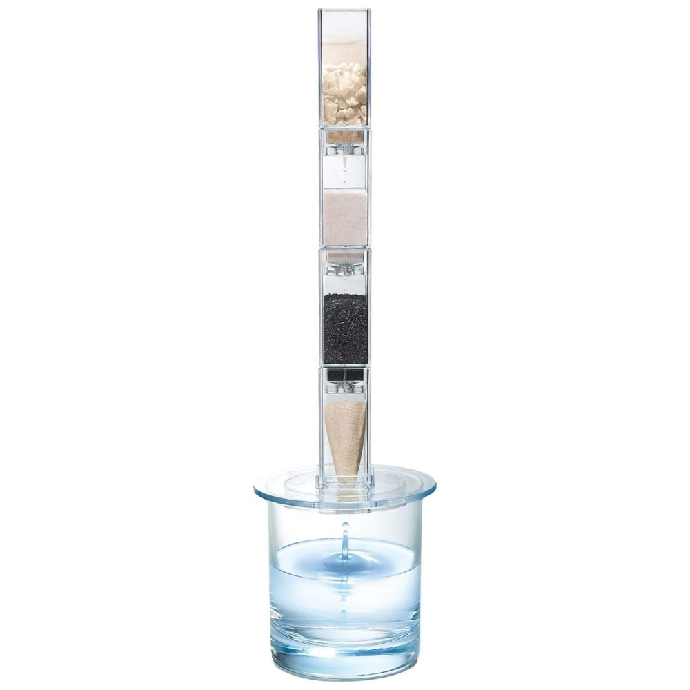 O kit contém um sistema de filtro de plástico, carvão ativo, areia, pedra e papel de filtro, permitindo a construção de uma planta de filtragem e dessalinização de água em sua mesa.
