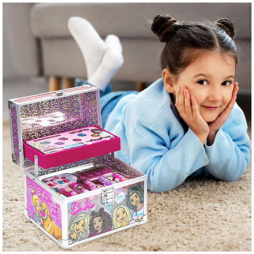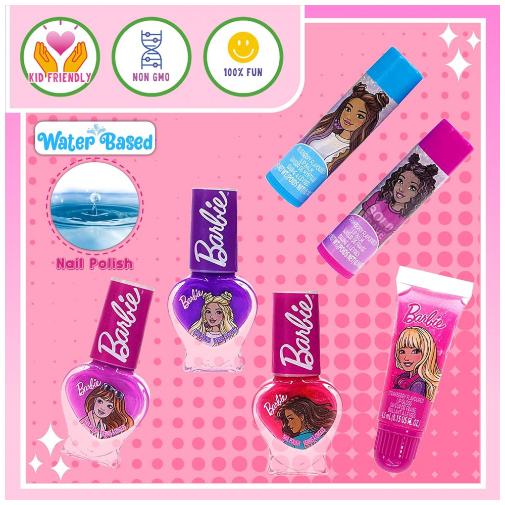 Kit de Maquiagem Infantil Lavável da Barbie para Crianças a Partir de 3 Anos, Rosa: FEITO PARA CRIANÇAS IDADE 3 E ACIMA Nosso conjunto de maquiagem Brilho labial, bálsamo labial, brilho dos olhos, brilho da bochecha e pincéis.