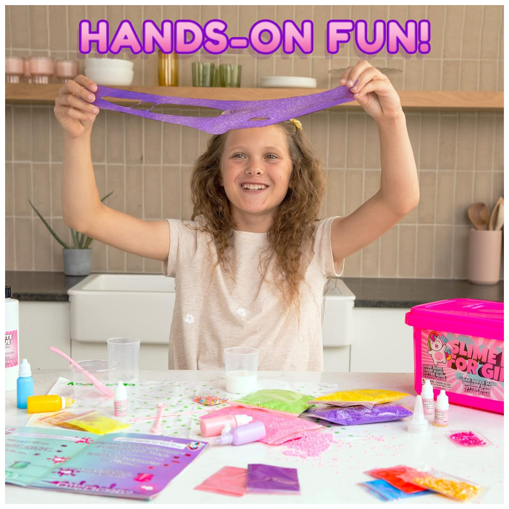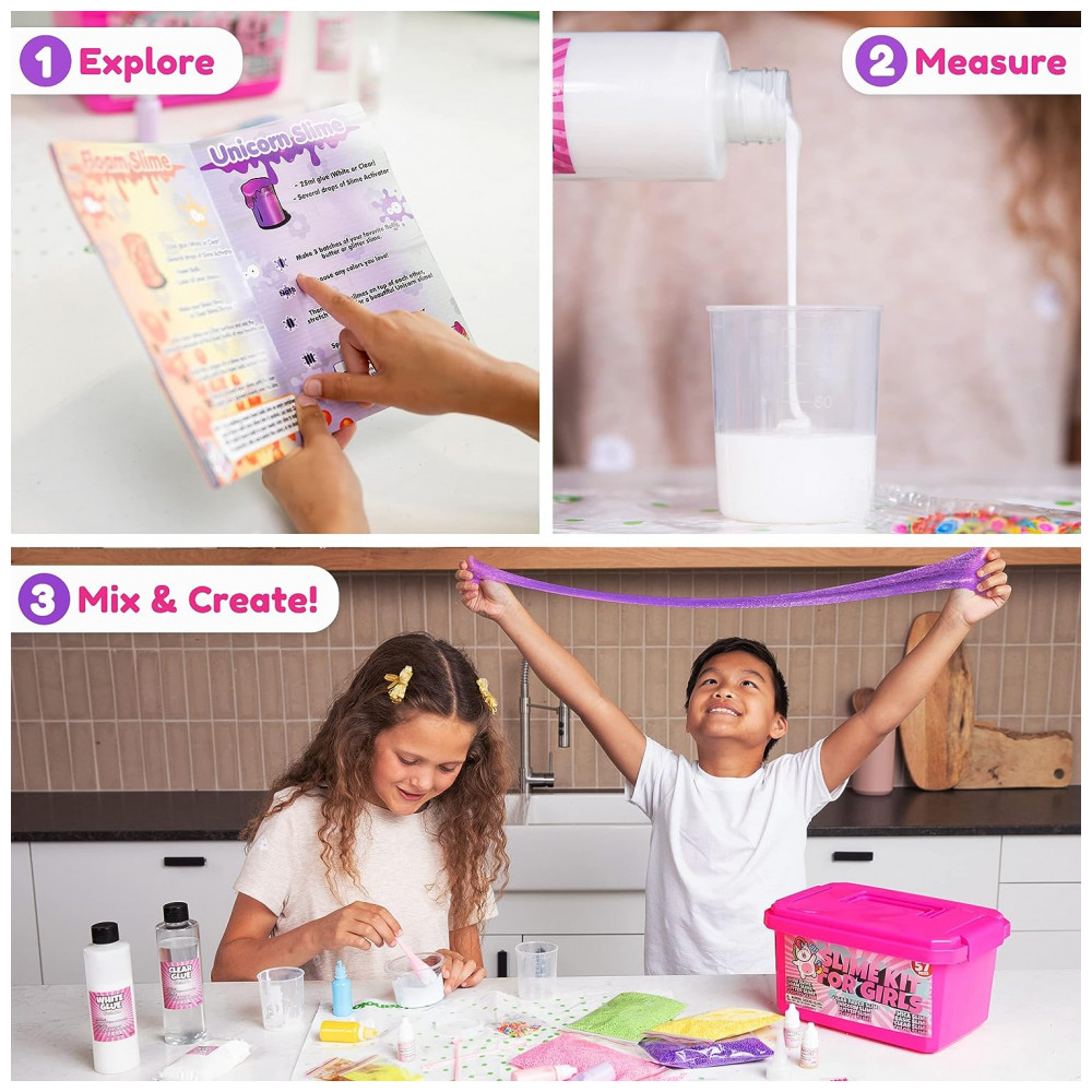 O kit inclui um livro completo, colorido e ilustrado com dez receitas fáceis de fazer, dicas, truques, sugestões, solução de problemas de slime e informações de segurança.