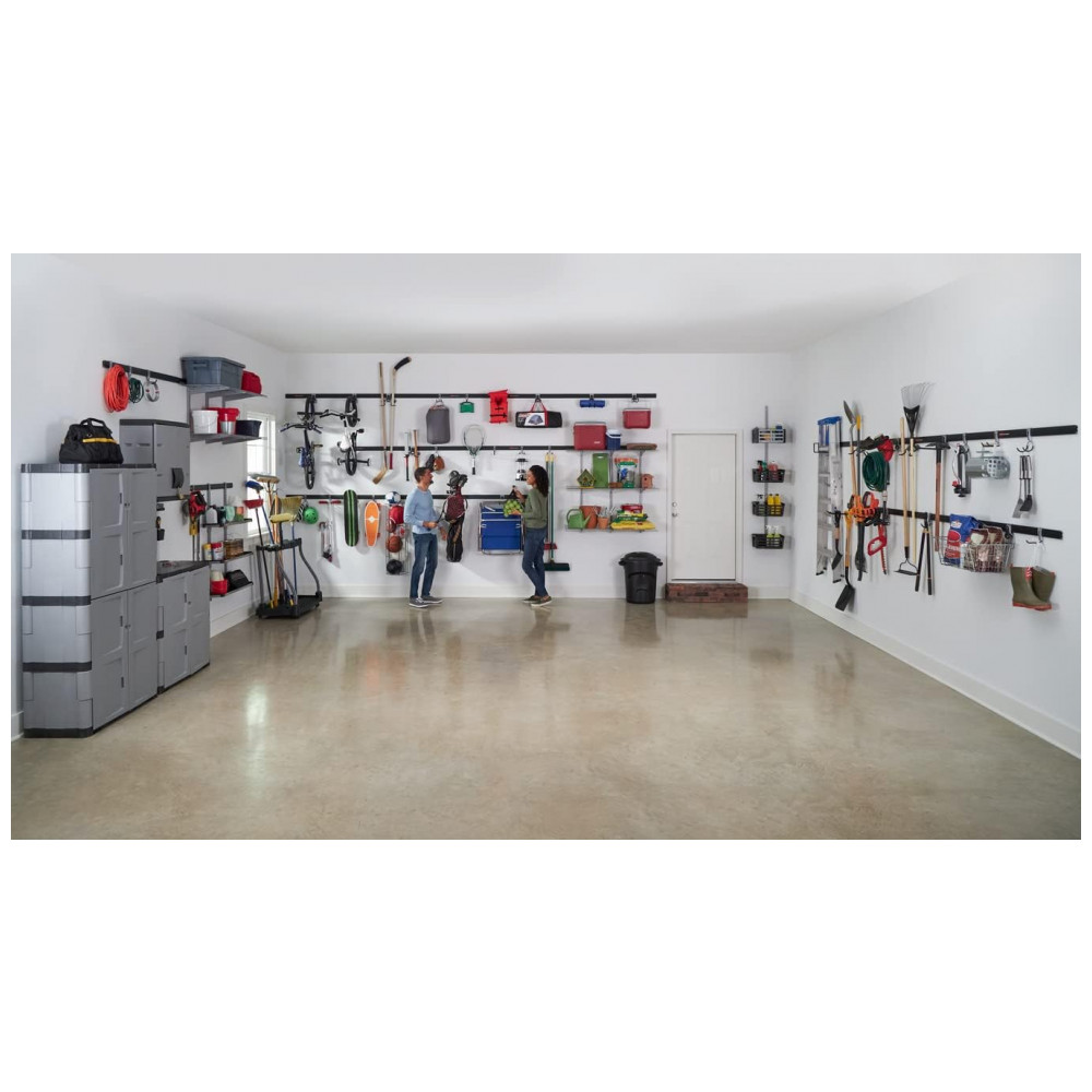 Kit Organizadores de Parede para Garagem 6 Trilhos e 18 Ganchos Rubbermaid: A FORMA RÁPIDA DE ORGANIZAR Equipada com grades, ganchos, prateleiras e armários, é uma solução de arrumação fácil que pode crescer à medida que a vida muda.
