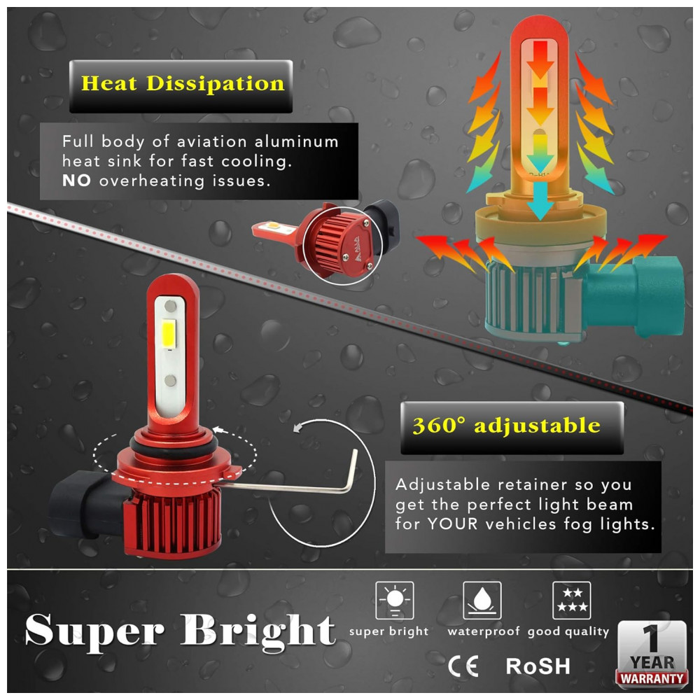 para atualizar o estoque de halogênio OEM, incandescente, HID H11 H8 H16 luz de nevoeiro, luz de funcionamento diurno DRL ou substituição de lâmpadas de luzes de mudança Potência de funcionamento 17,0 W, Volts 12 V 24 V IP67 à prova dágua Cor 6000K 6 k xenon branco Alimentado por tecnologia avançada de circuito LED brilhante driver IC inteligente integrado e material de alumínio de dissipação de calor de melhor resfriamento 606 e vida útil útil