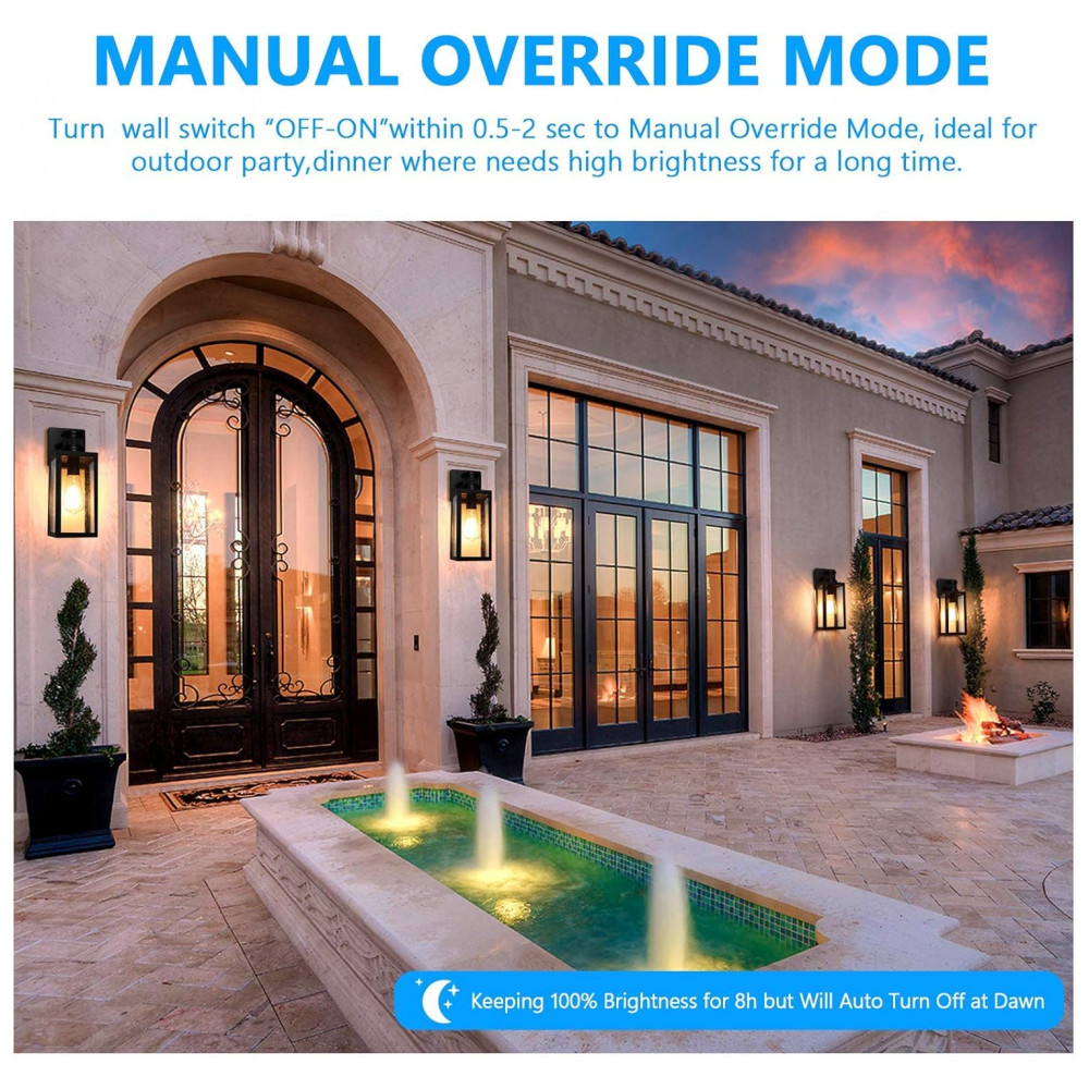 Modo de substituição manual exclusivo Se você quiser que essas arandelas de parede externas com sensor do crepúsculo ao amanhecer ofereçam forte brilho à noite por várias horas para ocasiões como festa, reunião de família ou outras ao ar livre, desligue o interruptor de parede com 0,52 seg.