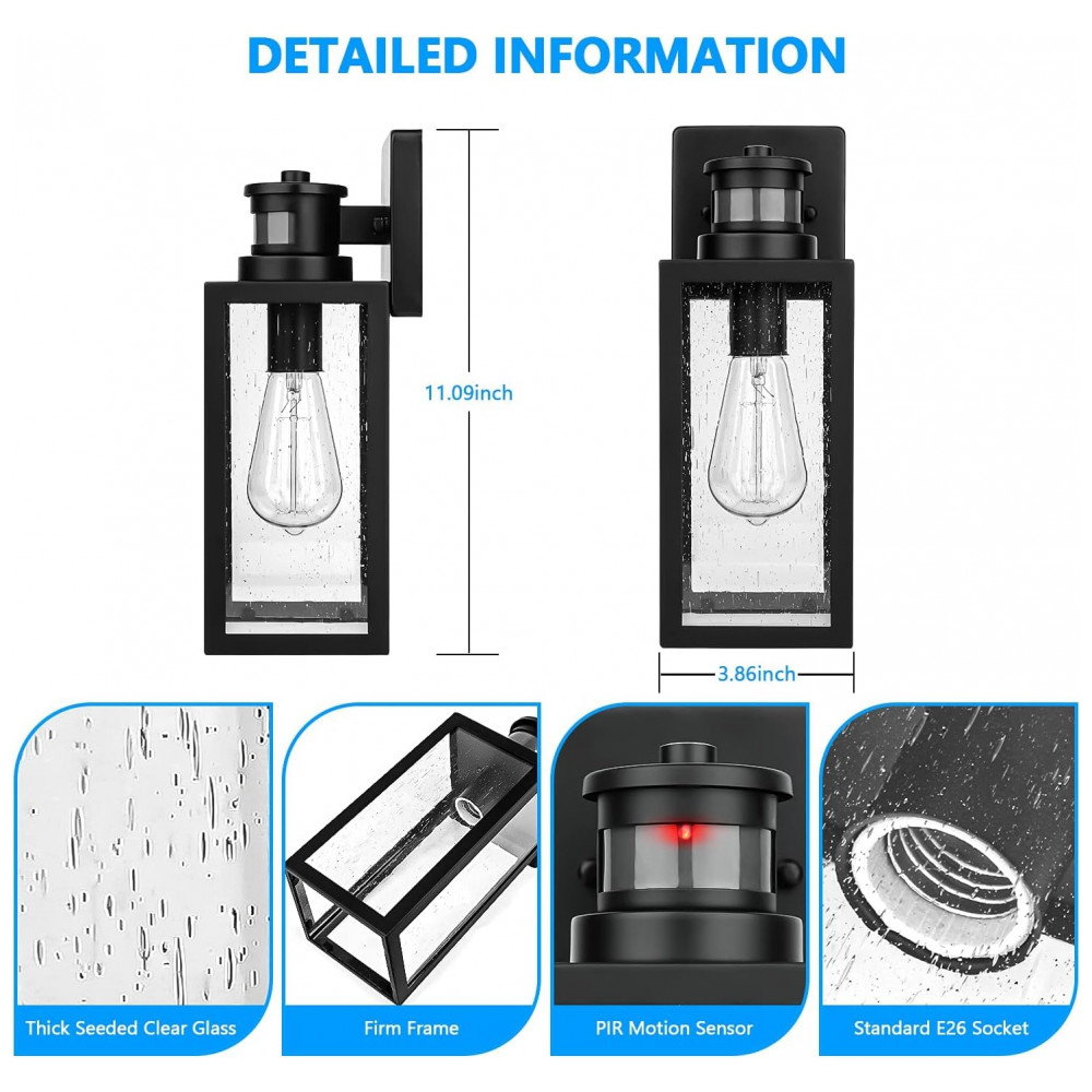 Estrutura de metal antiferrugem e vidro grosso semeado as luminárias de parede externa com sensor de movimento são bem feitas com material superior, a construção de metal firme faz com que você não se preocupe mais com ferrugem ou corrosão, o vidro semeado é fácil de limpar e parece fantástico, definitivamente derrote aqueles feitos de metal inferior e vidro fino e frágil, eles ficarão terrivelmente enferrujados e quebrados em pouco tempo, exatamente contra sua expectativa, não vale a pena comprar.
