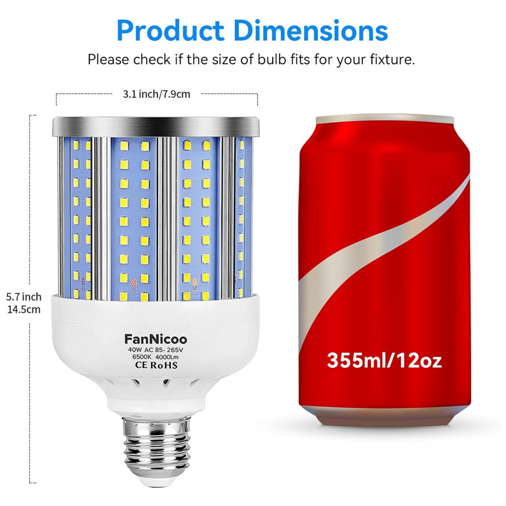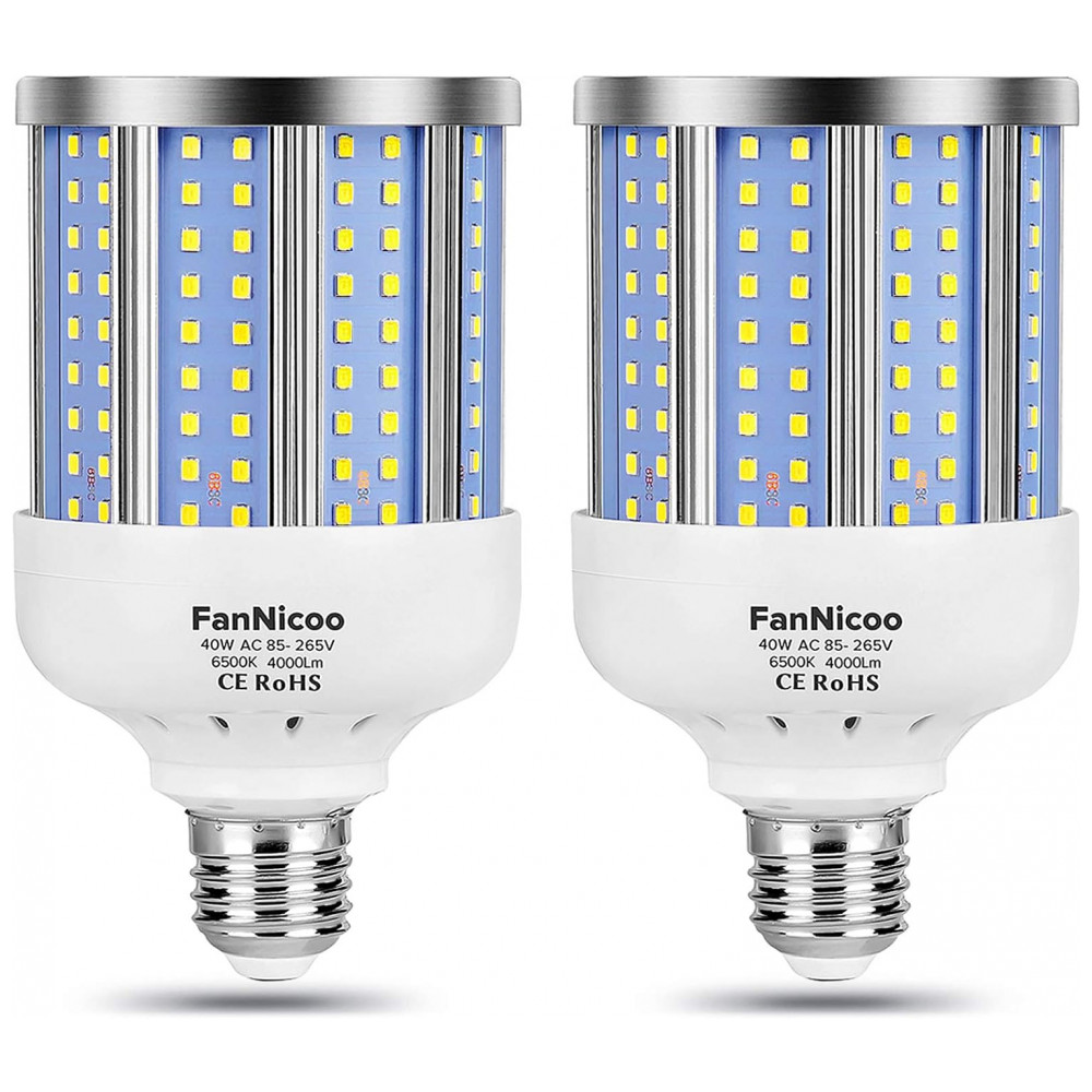 Lâmpada LED 280W 4000 Lumens 6500K Branca com Base E26, E27, 2 Unidades, FANNICOO, Branco: Economia de energia e alto brilho A lâmpada LED de milho FanNicoo 40W é equivalente a uma lâmpada incandescente de 280W, o que pode ajudá lo a economizar mais eletricidade Saída de potência ultra alta de até 4000 lúmens, iluminação omnidirecional de 360 em todos os ângulos, cobrindo uma área maior.