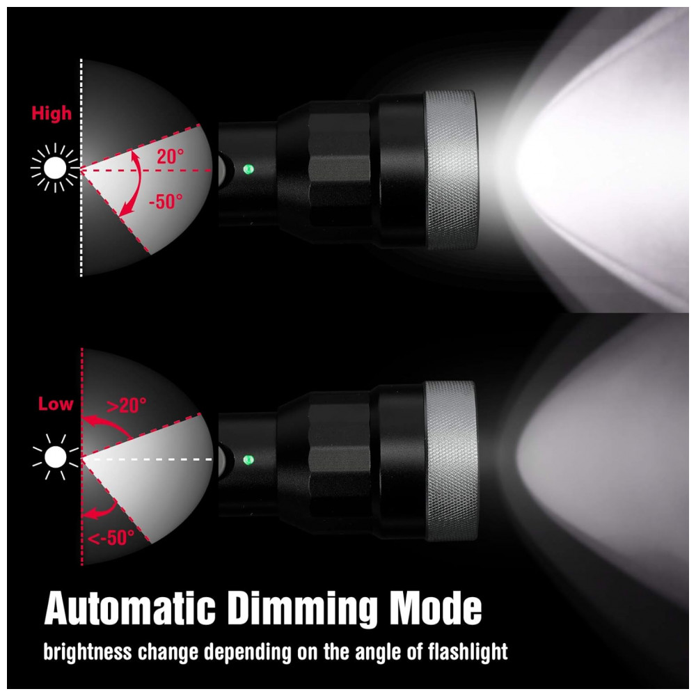 Pressione por muito tempo o interruptor de escurecimento para a engrenagem automática de escurecimento que mudará o brilho dependendo do ângulo da lanterna.